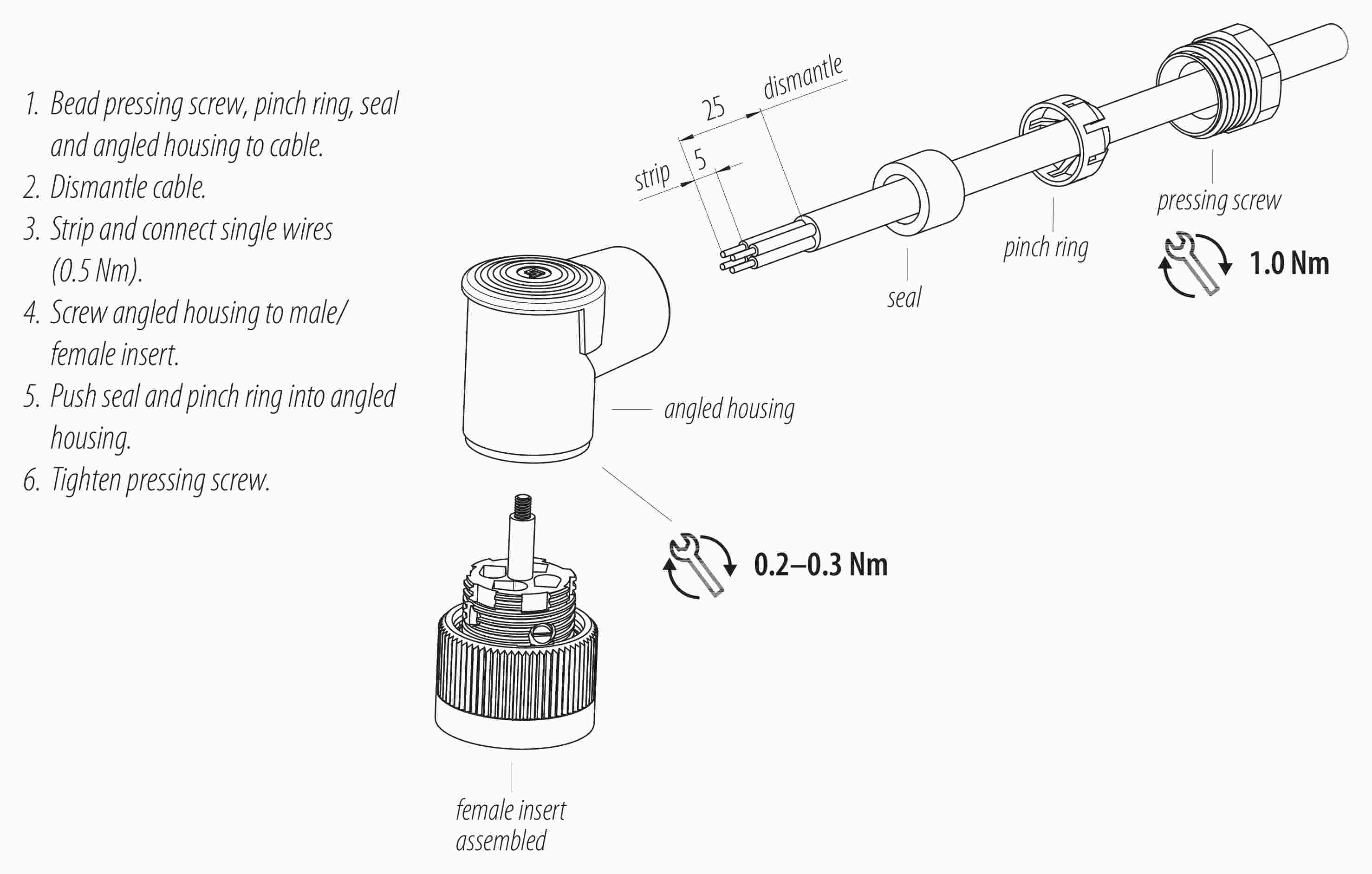 - To protect against unintentional opening of the connector, the thread between the housing and the connector head must be secured with a suitable cyanoacrylate adhesive when used in circuits with voltages dangerous to the touch. This does not apply to connectors used in SELV and PELV circuits according to IEC 61140 (EN 61140, VDE 0140-1).