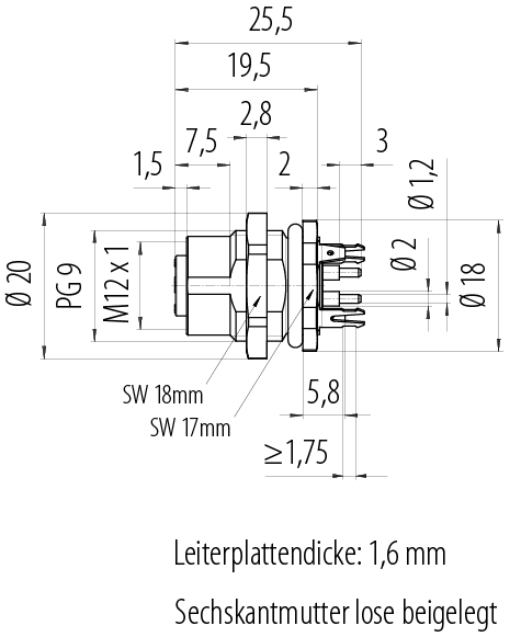 M12 Flanschdose, Polzahl: 4, geschirmt, THT, IP68, UL 2238, PG 9, Rückwandmontage