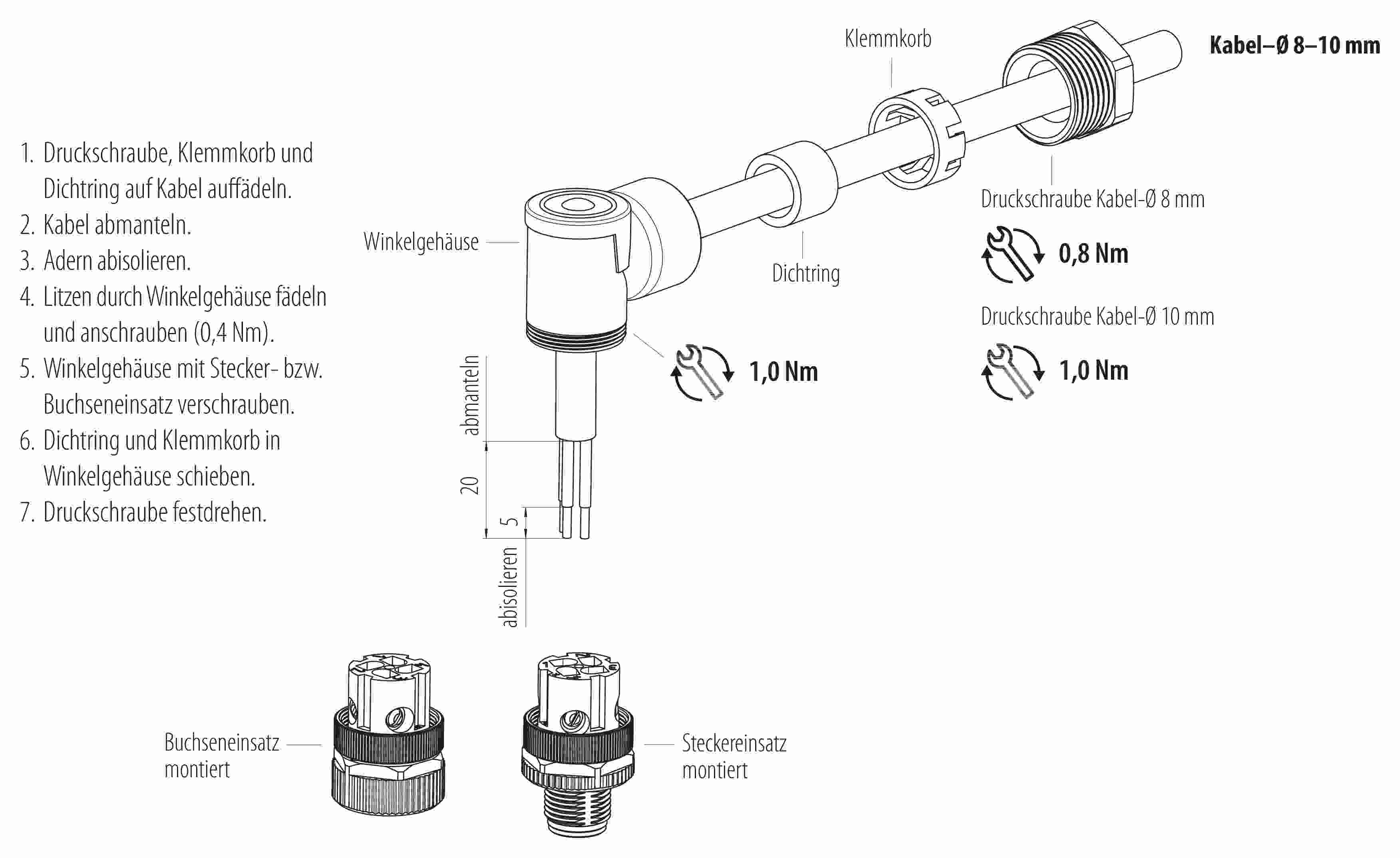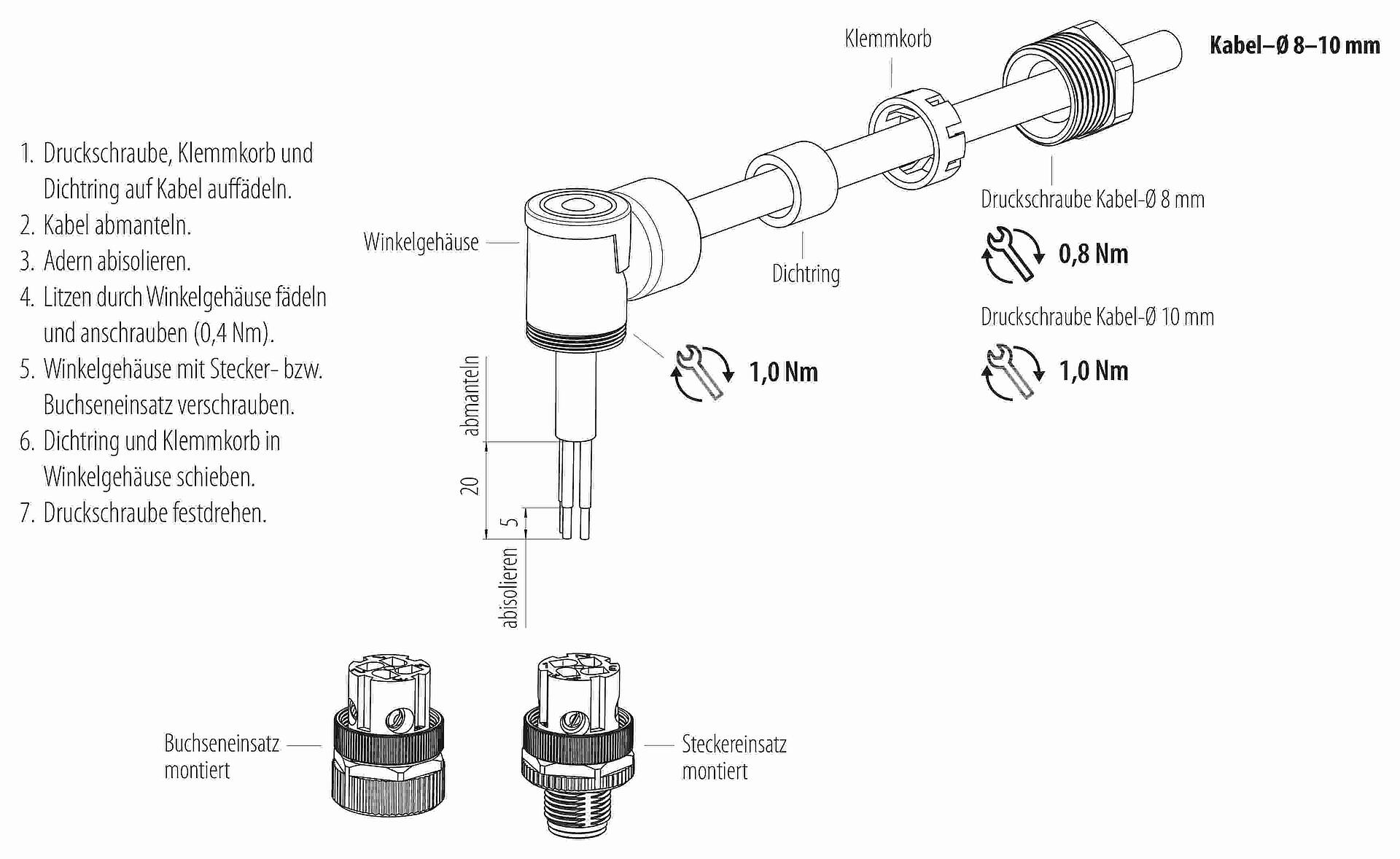 - Zum Verriegeln des Kabelsteckverbinders mit dem Gerätesteckverbinder wird der Gewindering „handfest“ (ca. 60 cNm) angezogen.