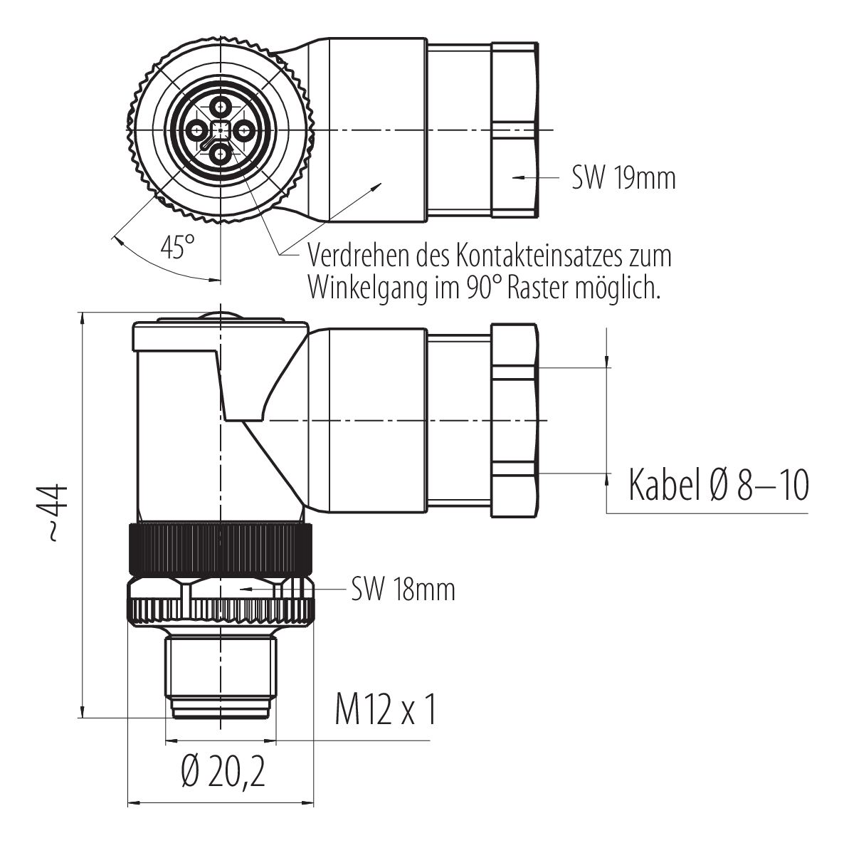 M12 Winkelstecker, Polzahl: 4, 8,0-10,0 mm, ungeschirmt, schraubklemm, IP67, UL 2238, VDE