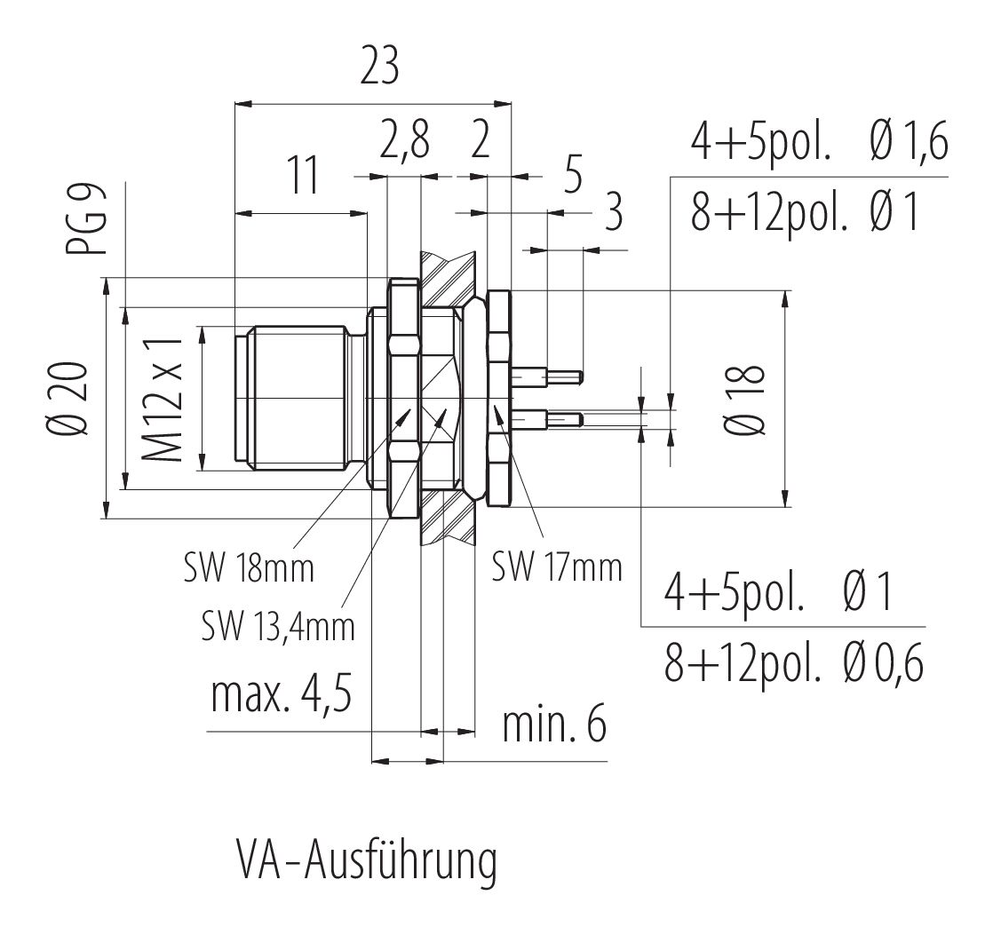 4. M12 Flanschstecker, Polzahl: 8, ungeschirmt, THT, IP68, UL 2238, PG 9, Rückwandmontage, Edelstahl
