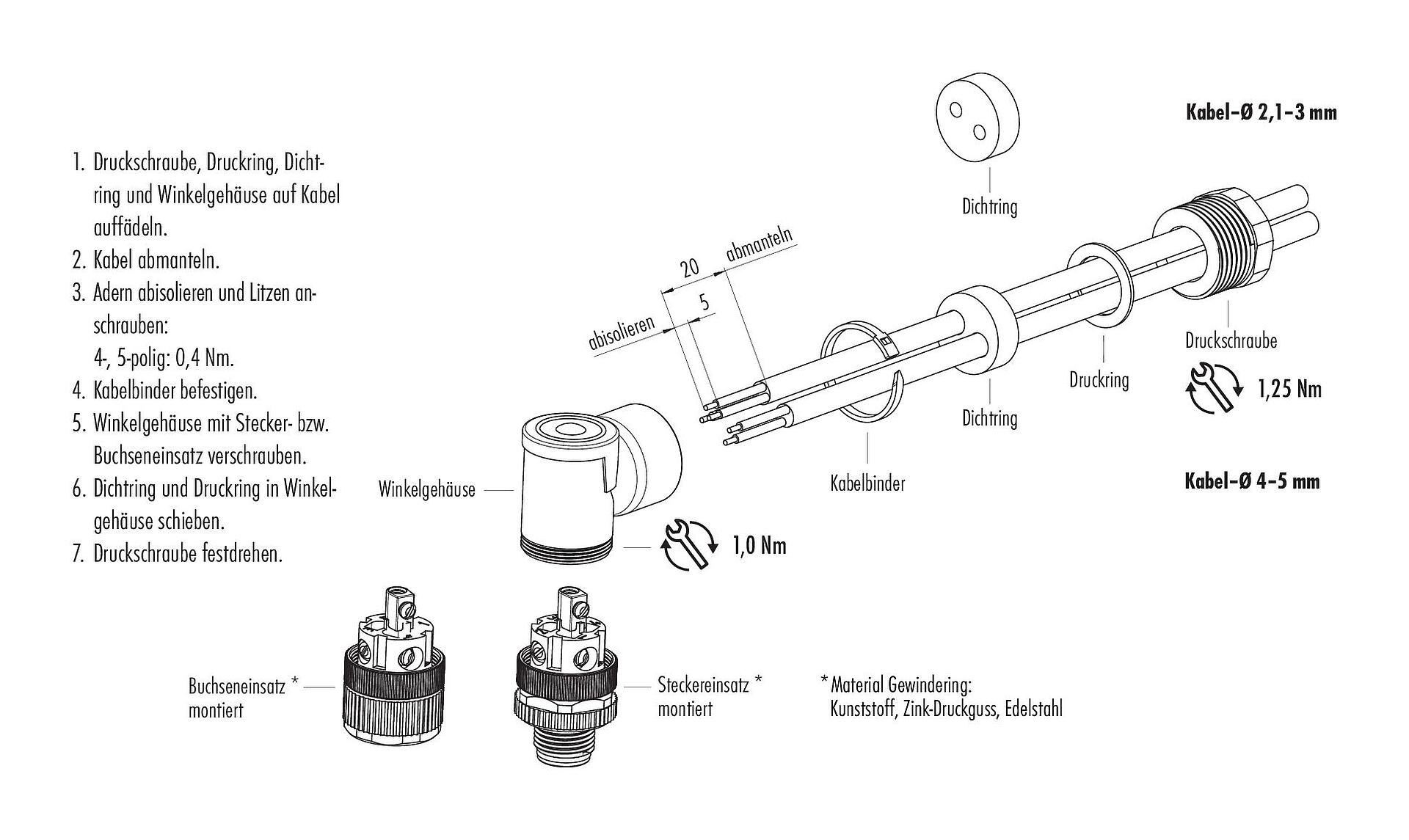 - Zum Verriegeln des Kabelsteckverbinders mit dem Gerätesteckverbinder wird der Gewindering „handfest“ (ca. 60 cNm) angezogen.