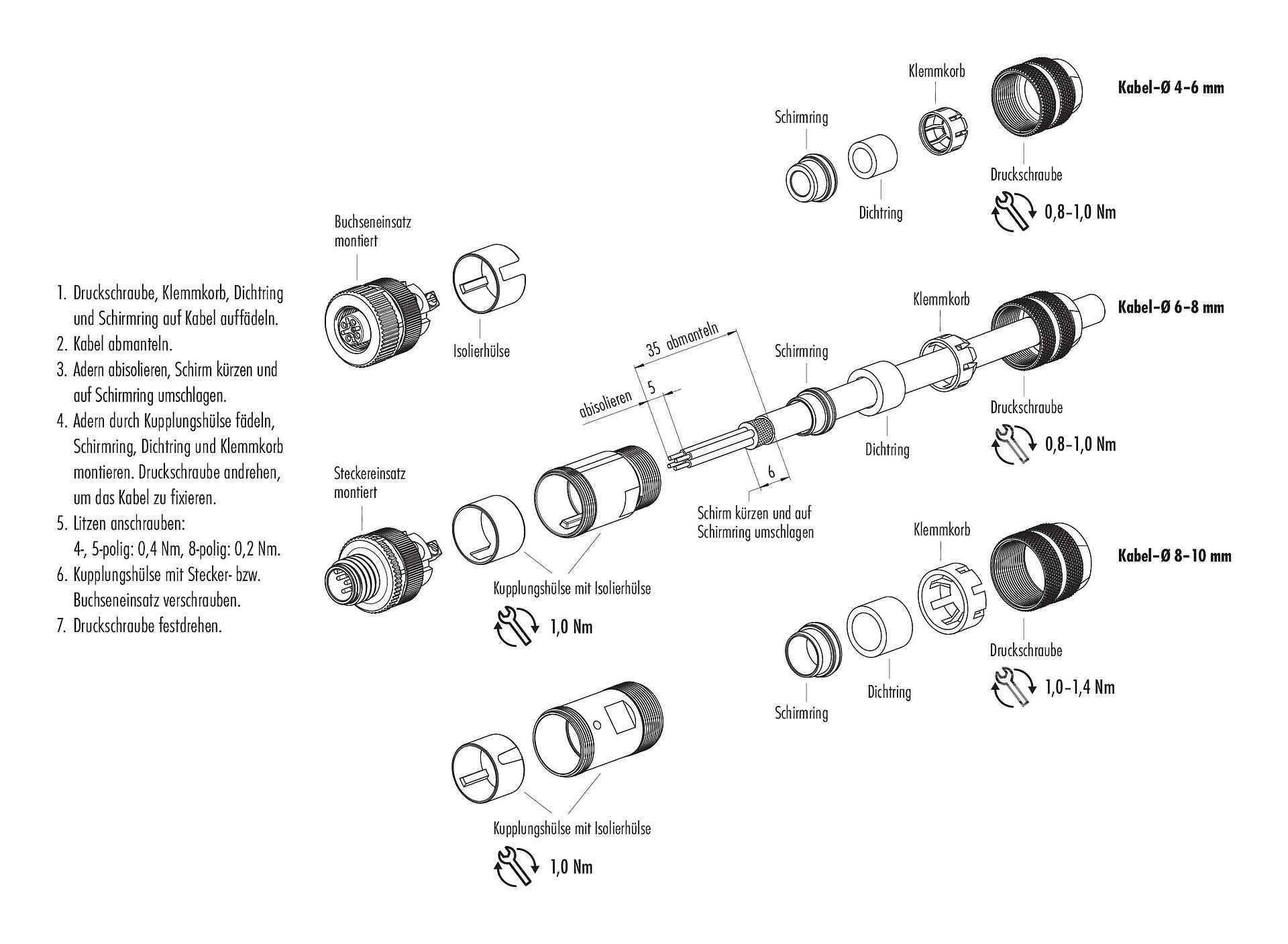 8. Zum Verriegeln des Kabelsteckverbinders mit dem Gerätesteckverbinder wird der Gewindering „handfest“ (ca. 60 cNm) angezogen.