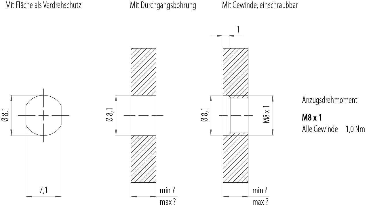 - Zum Verriegeln des Kabelsteckverbinders mit dem Gerätesteckverbinder wird der Gewindering „handfest“ (ca. 40 cNm) angezogen. Ein Drehmomentschlüssel für SW9 ist als Zubehör erhältlich (Bestell.-Nr. 07 0085 000).