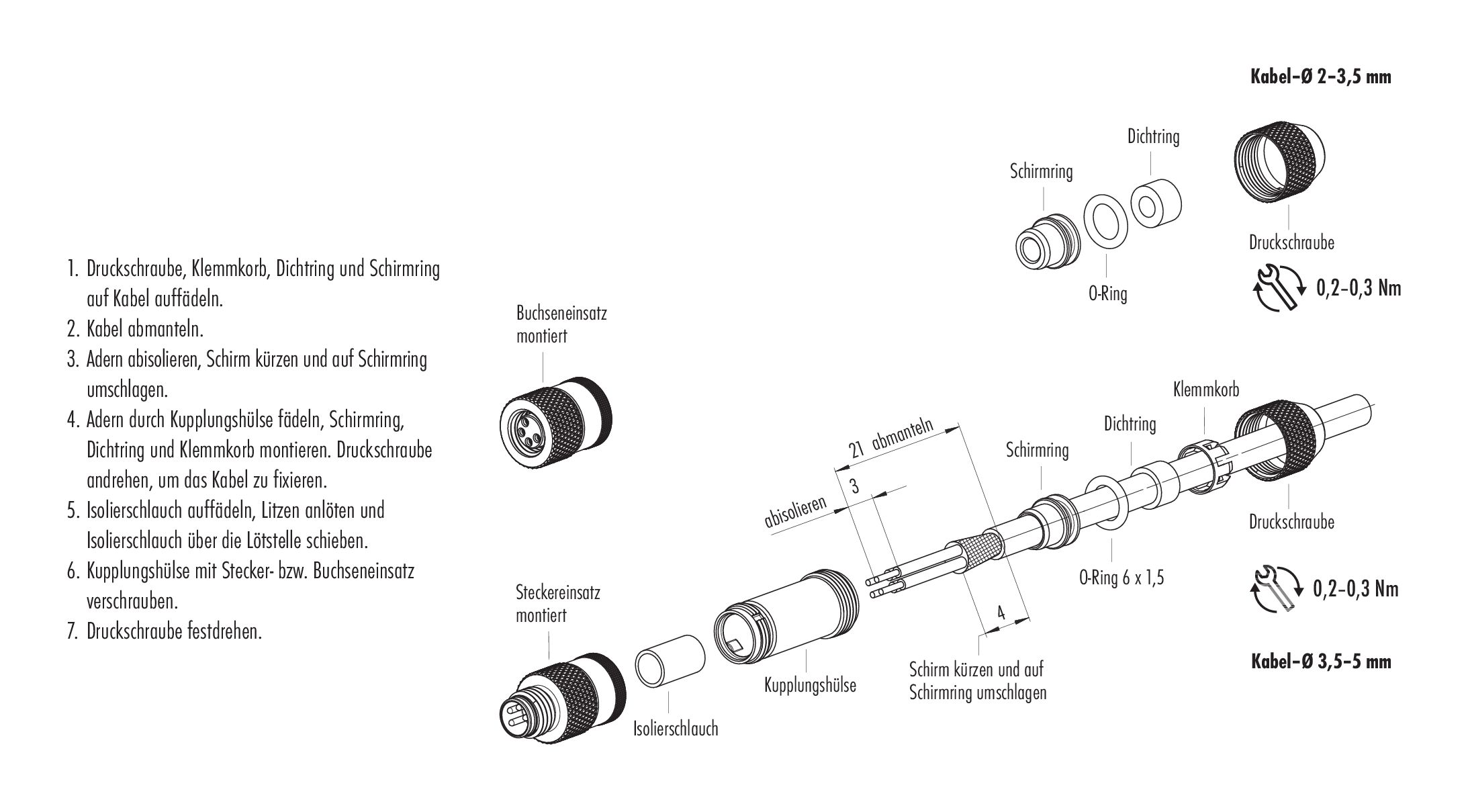 3. Zum Schutz gegen unbeabsichtigtes Öffnen des Steckverbinders, ist bei einem Einsatz in Stromkreisen mit berührungsgefährlichen Spannungen das Gewinde zwischen dem Gehäuse und dem Steckverbinderkopf mit einem geeigneten Cyanacrylatkleber zu sichern. Dies gilt nicht für Steckverbinder, die in SELV und PELV Stromkreisen nach IEC 61140 (EN 61140, VDE 0140-1) eingesetzt werden.