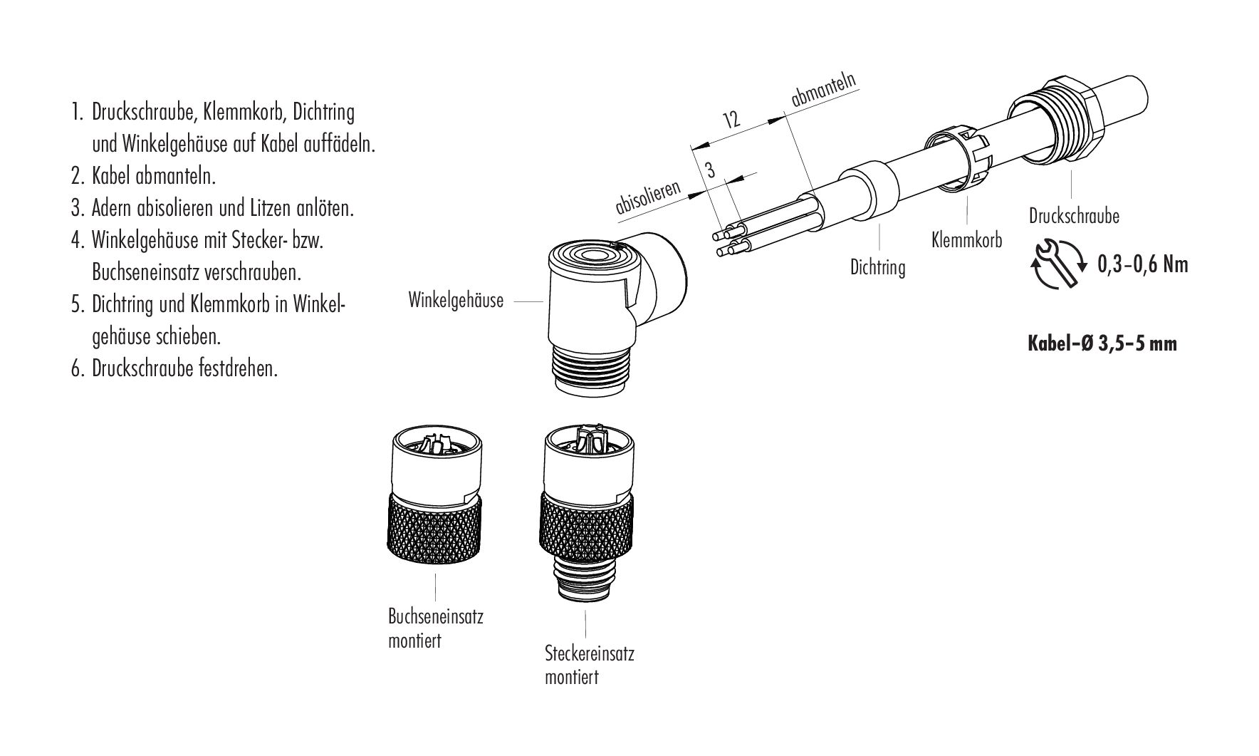 - Zum Schutz gegen unbeabsichtigtes Öffnen des Steckverbinders, ist bei einem Einsatz in Stromkreisen mit berührungsgefährlichen Spannungen das Gewinde zwischen dem Gehäuse und dem Steckverbinderkopf mit einem geeigneten Cyanacrylatkleber zu sichern. Dies gilt nicht für Steckverbinder, die in SELV und PELV Stromkreisen nach IEC 61140 (EN 61140, VDE 0140-1) eingesetzt werden.