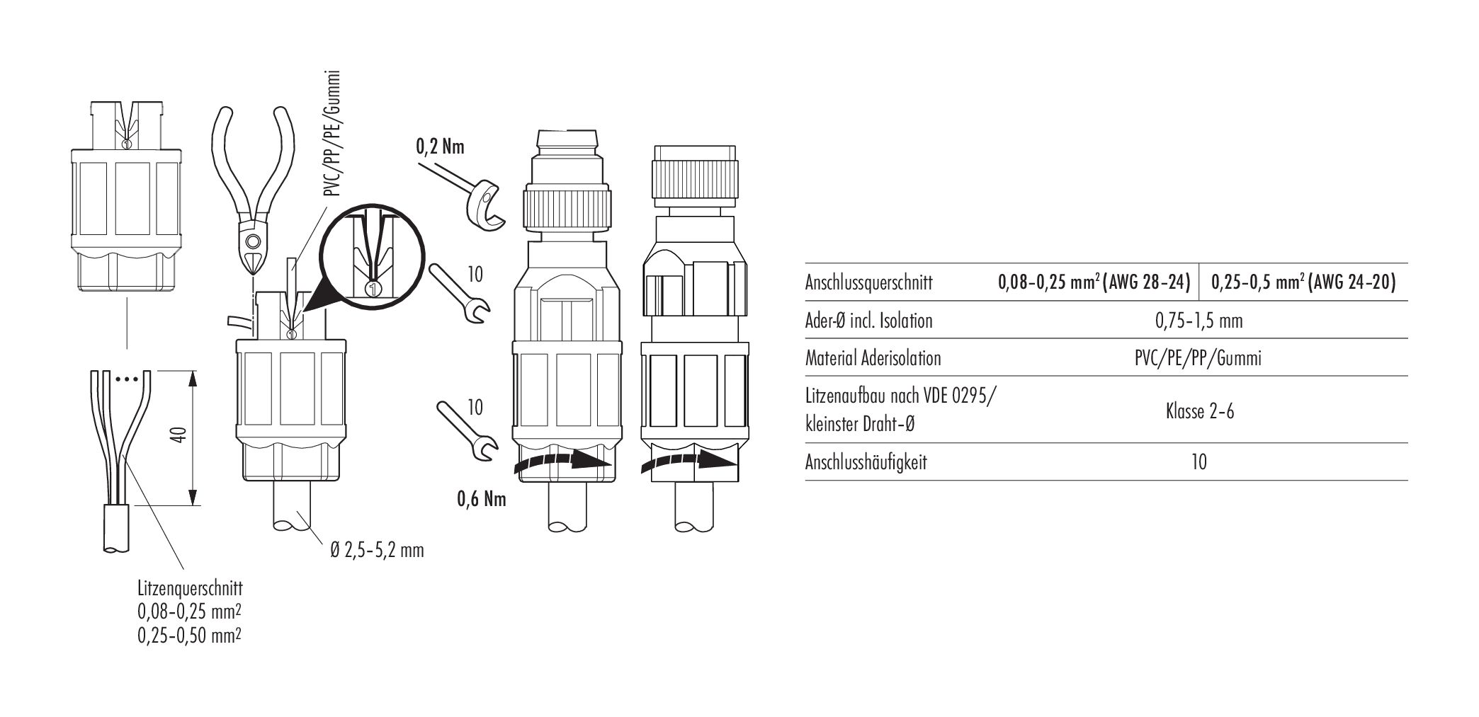 | Anschlussquerschnitt | 0,25-0,50 mm² / AWG 24-20 |