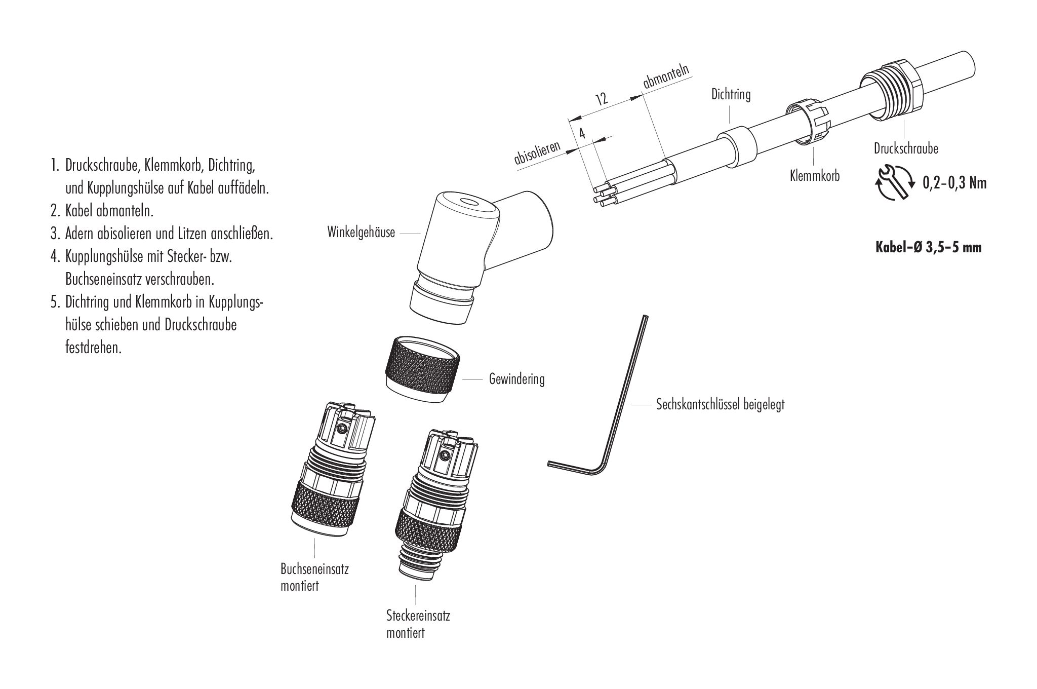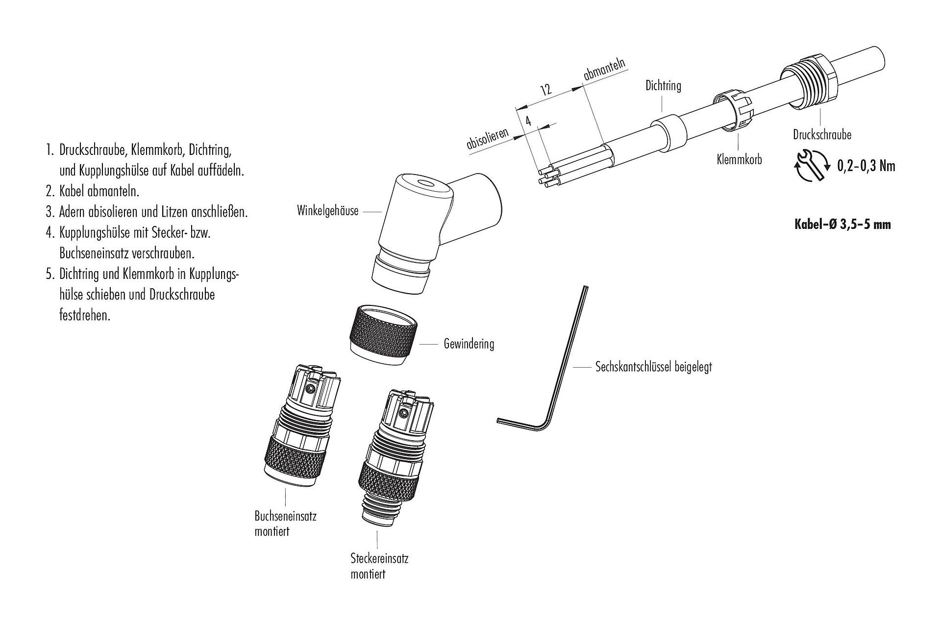 - Zum Verriegeln des Kabelsteckverbinders mit dem Gerätesteckverbinder wird der Gewindering „handfest“ (ca. 50 cNm) angezogen.
