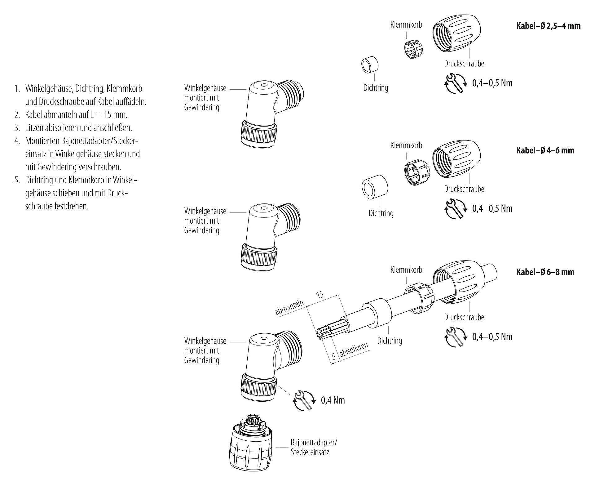 Bajonett Winkelstecker, Polzahl: 8, 2,5-4,0 mm, ungeschirmt, löten, IP67