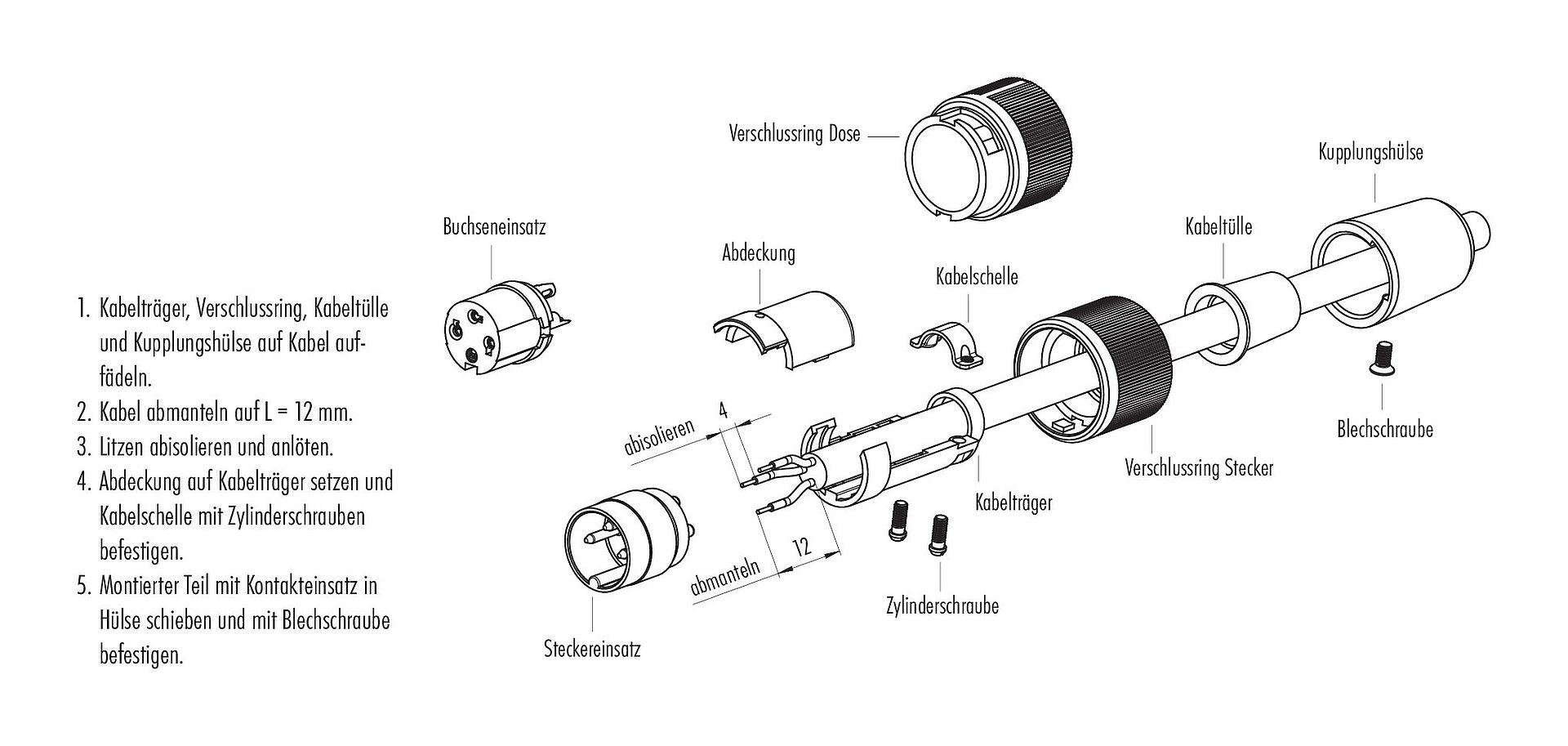 - Zum Schutz gegen unbeabsichtigtes Öffnen des Steckverbinders, ist bei einem Einsatz in Stromkreisen mit berührungsgefährlichen Spannungen das Gewinde zwischen dem Gehäuse und dem Steckverbinderkopf mit einem geeigneten Cyanacrylatkleber zu sichern. Dies gilt nicht für Steckverbinder, die in SELV und PELV Stromkreisen nach IEC 61140 (EN 61140, VDE 0140-1) eingesetzt werden.