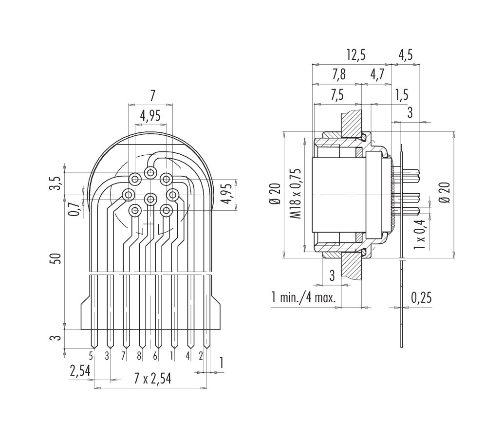 M16 Flanschdose, Polzahl: 8 (08-a), ungeschirmt, THT, IP68, M18x0,75, Rückwandmontage