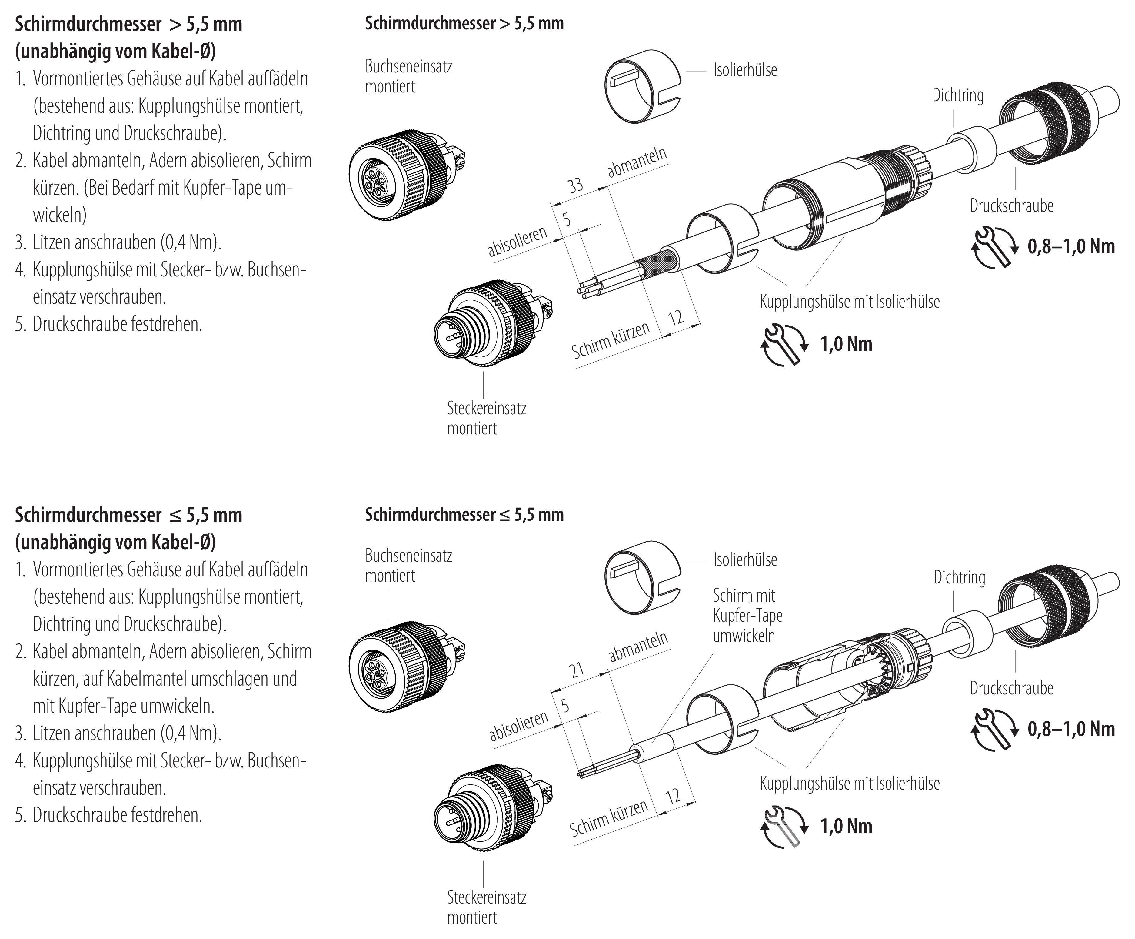 - Zum Verriegeln des Kabelsteckverbinders mit dem Gerätesteckverbinder wird der Gewindering „handfest“ (ca. 60 cNm) angezogen.