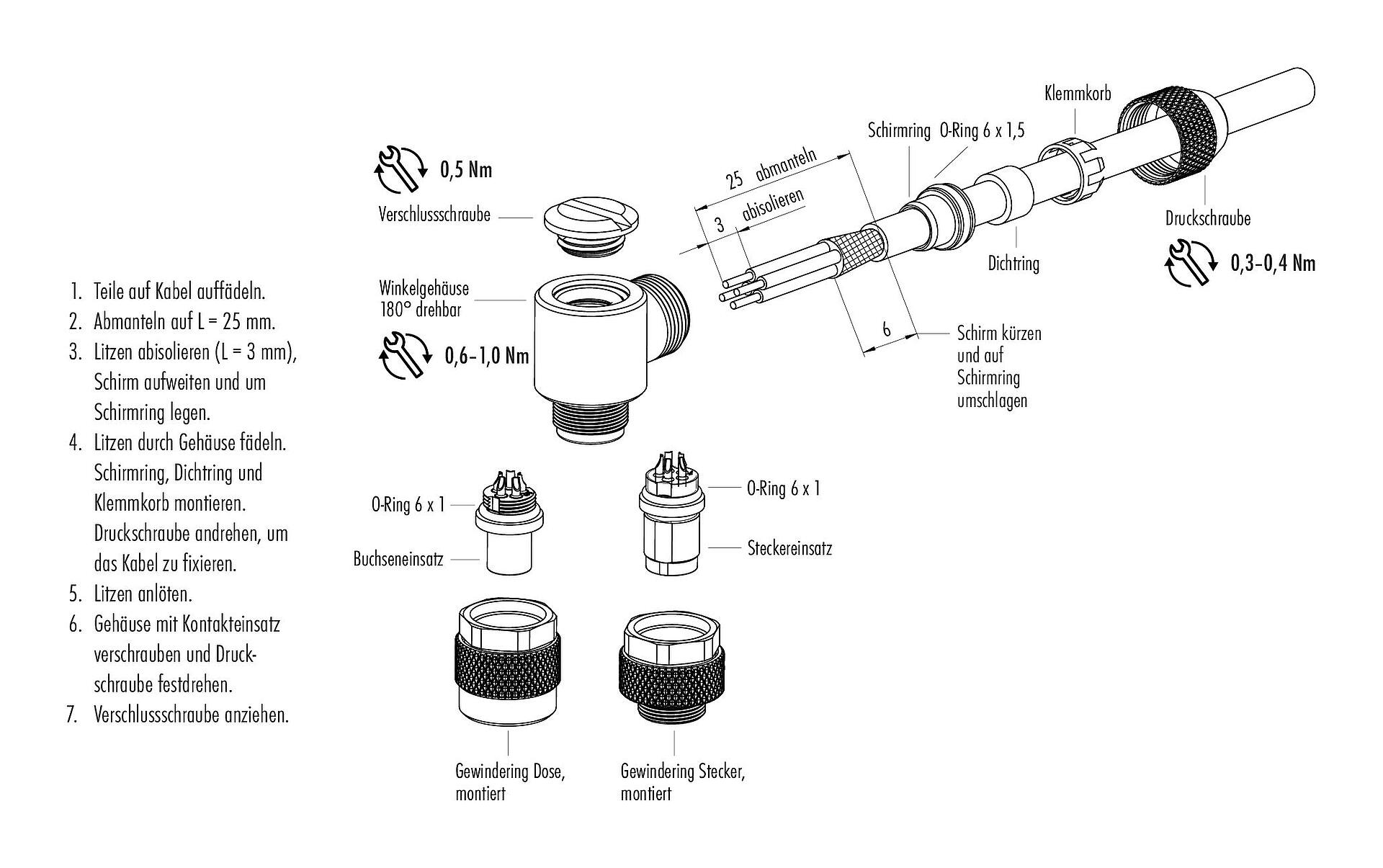- Zum Schutz gegen unbeabsichtigtes Öffnen des Steckverbinders, ist bei einem Einsatz in Stromkreisen mit berührungsgefährlichen Spannungen das Gewinde zwischen dem Gehäuse und dem Steckverbinderkopf mit einem geeigneten Cyanacrylatkleber zu sichern. Dies gilt nicht für Steckverbinder, die in SELV und PELV Stromkreisen nach IEC 61140 (EN 61140, VDE 0140-1) eingesetzt werden.