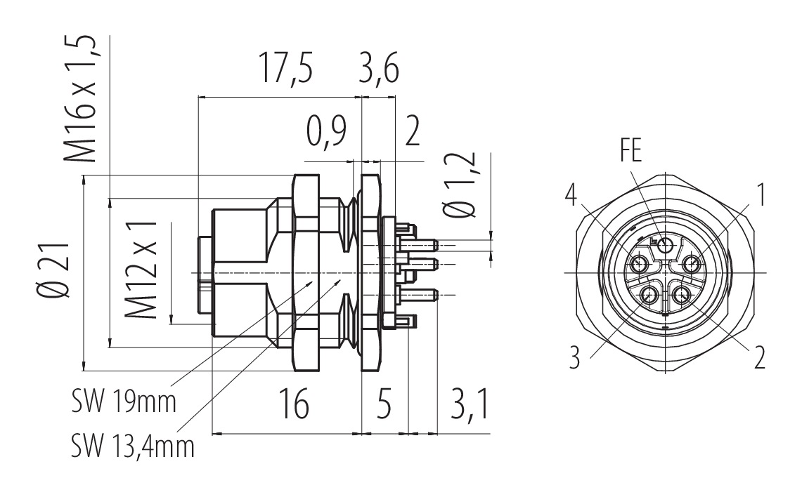 M12 Embase femelle, Contacts: 4+FE, non blindé, THR, IP67, UL 2238, M16x1,5, Montage mural arrière