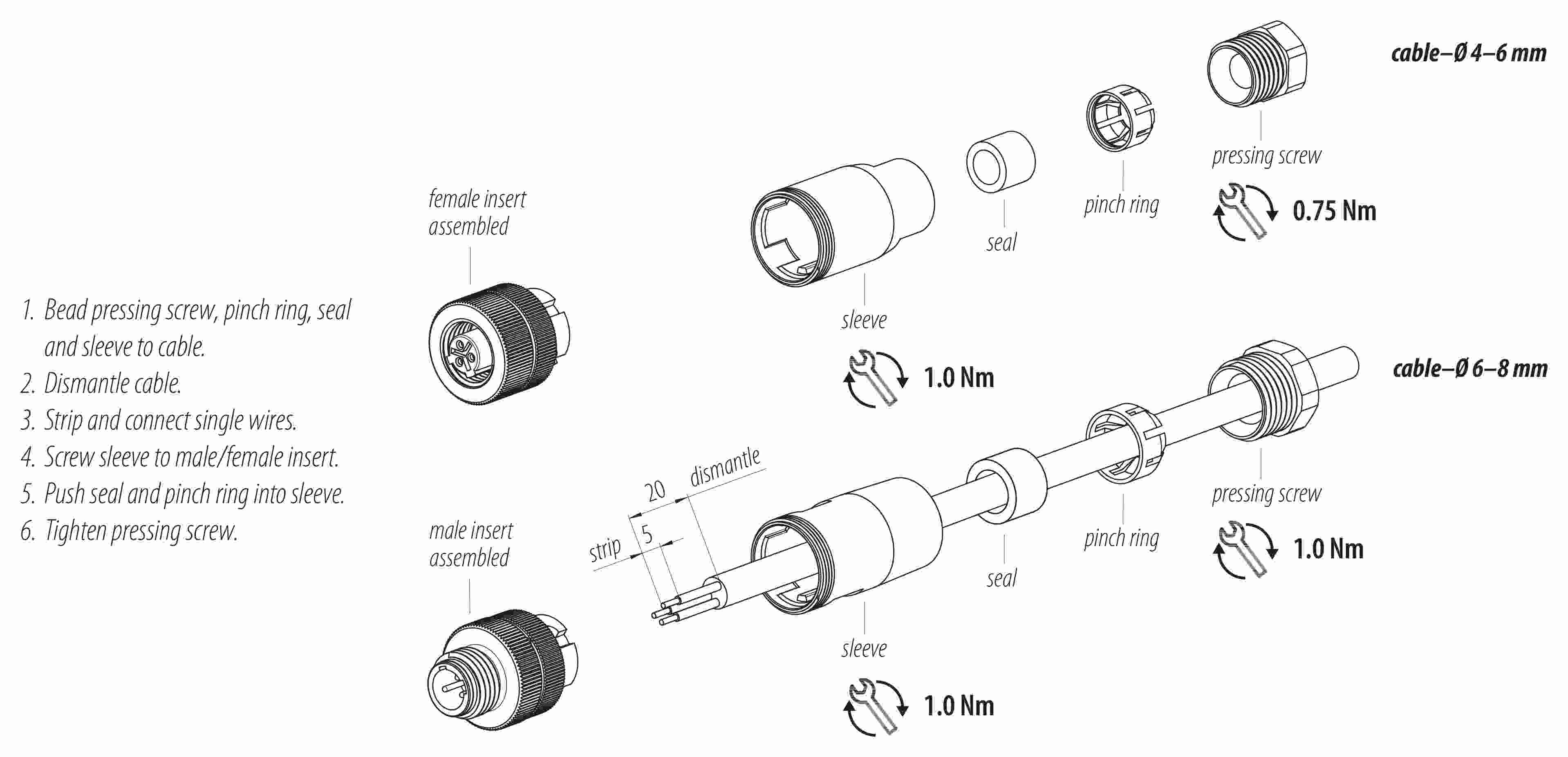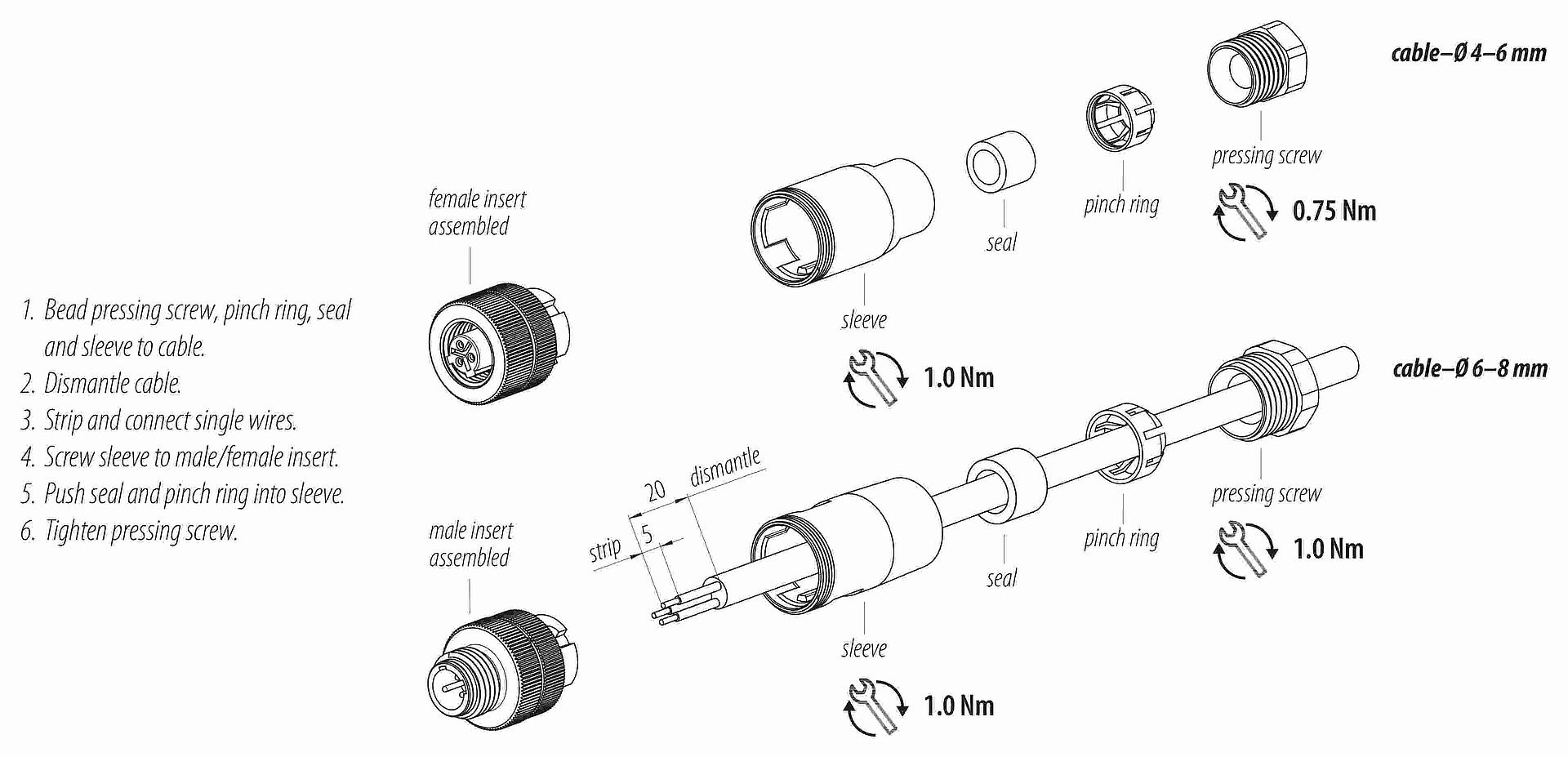 - Pour éviter l'ouverture involontaire du connecteur, lorsqu'il est utilisé dans des circuits dont la tension est dangereuse au toucher, le fil entre le boîtier et la tête du connecteur doit être fixé avec un adhésif cyanoacrylate approprié. Ceci ne s'applique pas aux connecteurs utilisés dans les circuits SELV et PELV selon la norme IEC 61140 (EN 61140, VDE 0140-1).