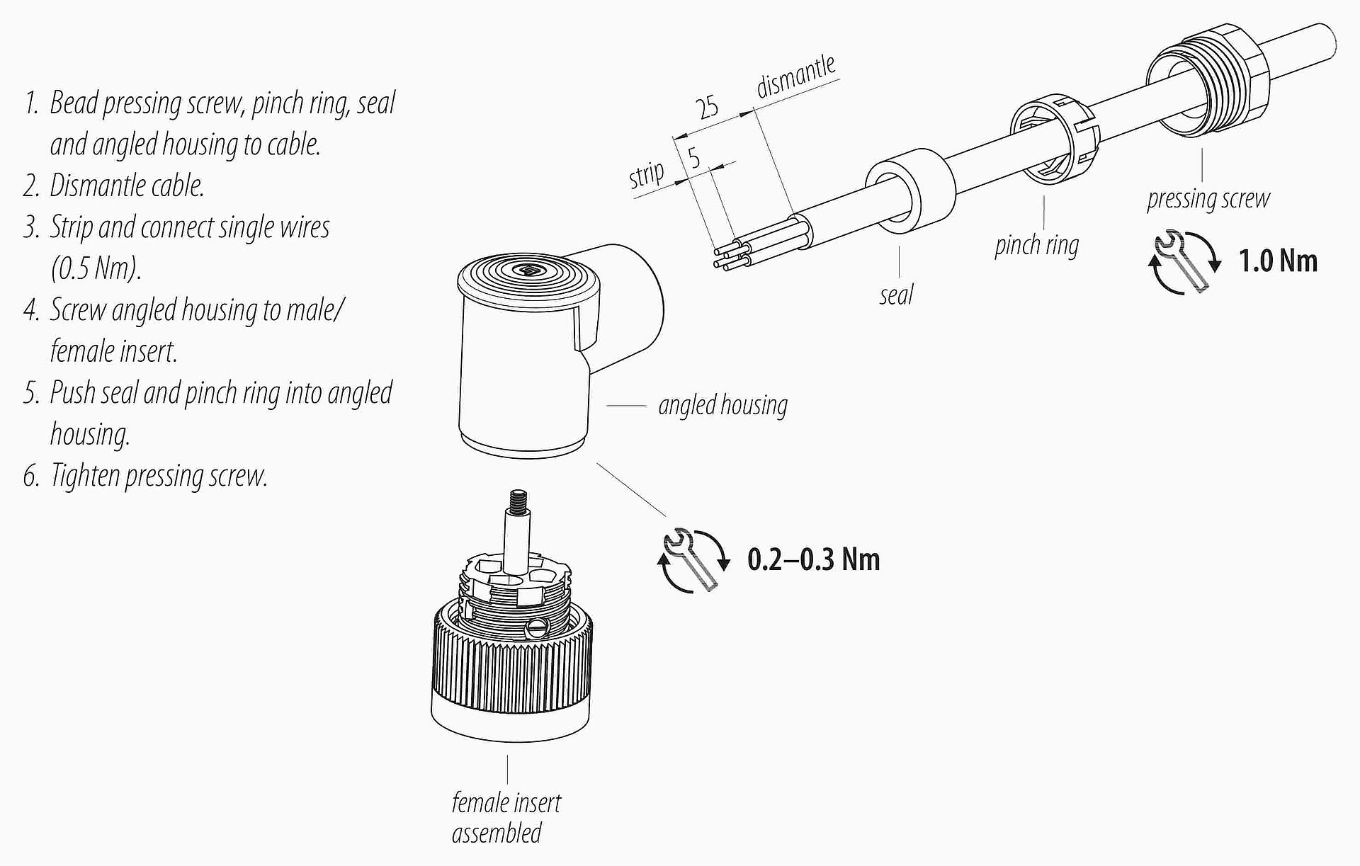 - Pour éviter l'ouverture involontaire du connecteur, lorsqu'il est utilisé dans des circuits dont la tension est dangereuse au toucher, le fil entre le boîtier et la tête du connecteur doit être fixé avec un adhésif cyanoacrylate approprié. Ceci ne s'applique pas aux connecteurs utilisés dans les circuits SELV et PELV selon la norme IEC 61140 (EN 61140, VDE 0140-1).