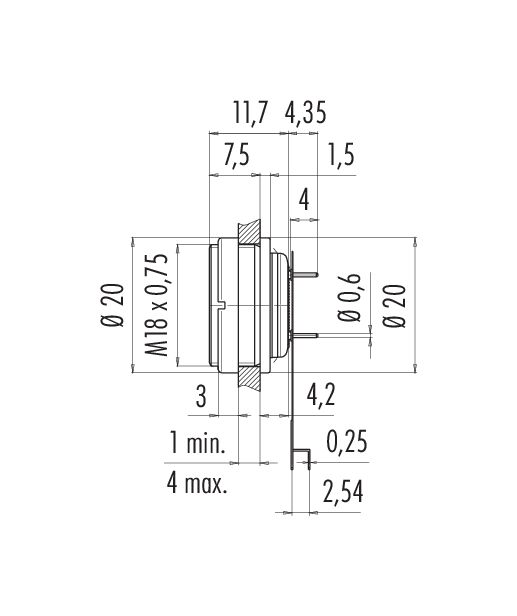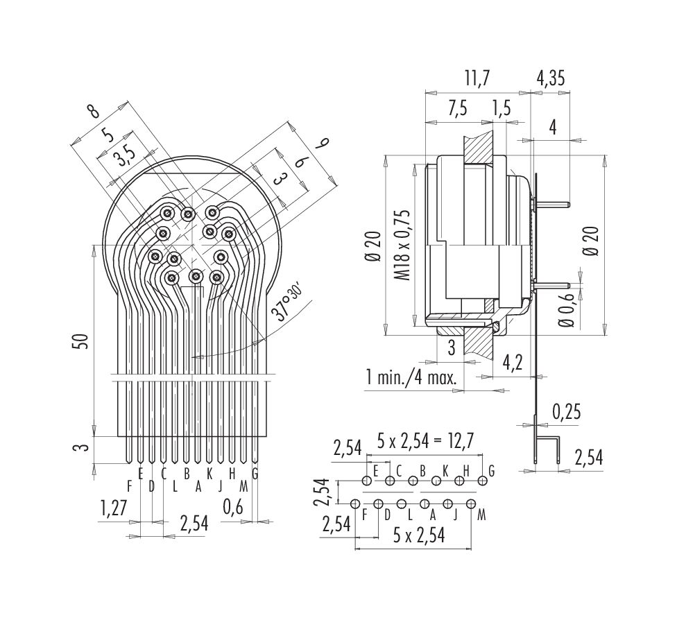 M16 Embase femelle, Contacts: 12 (12-a), non blindé, THT, IP67, M18x0,75, Montage mural arrière