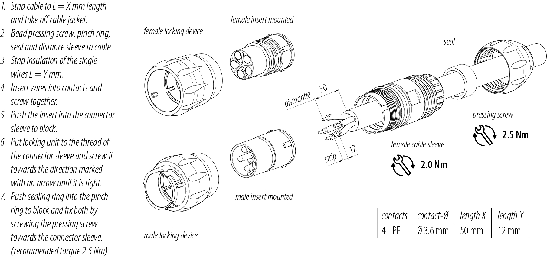 - Les connecteurs utilisés dans des circuits dont la tension est dangereuse pour le toucher ne peuvent être installés et utilisés que par des personnes ayant une formation en électrotechnique ou sous leur supervision, en tenant compte des réglementations et normes applicables.