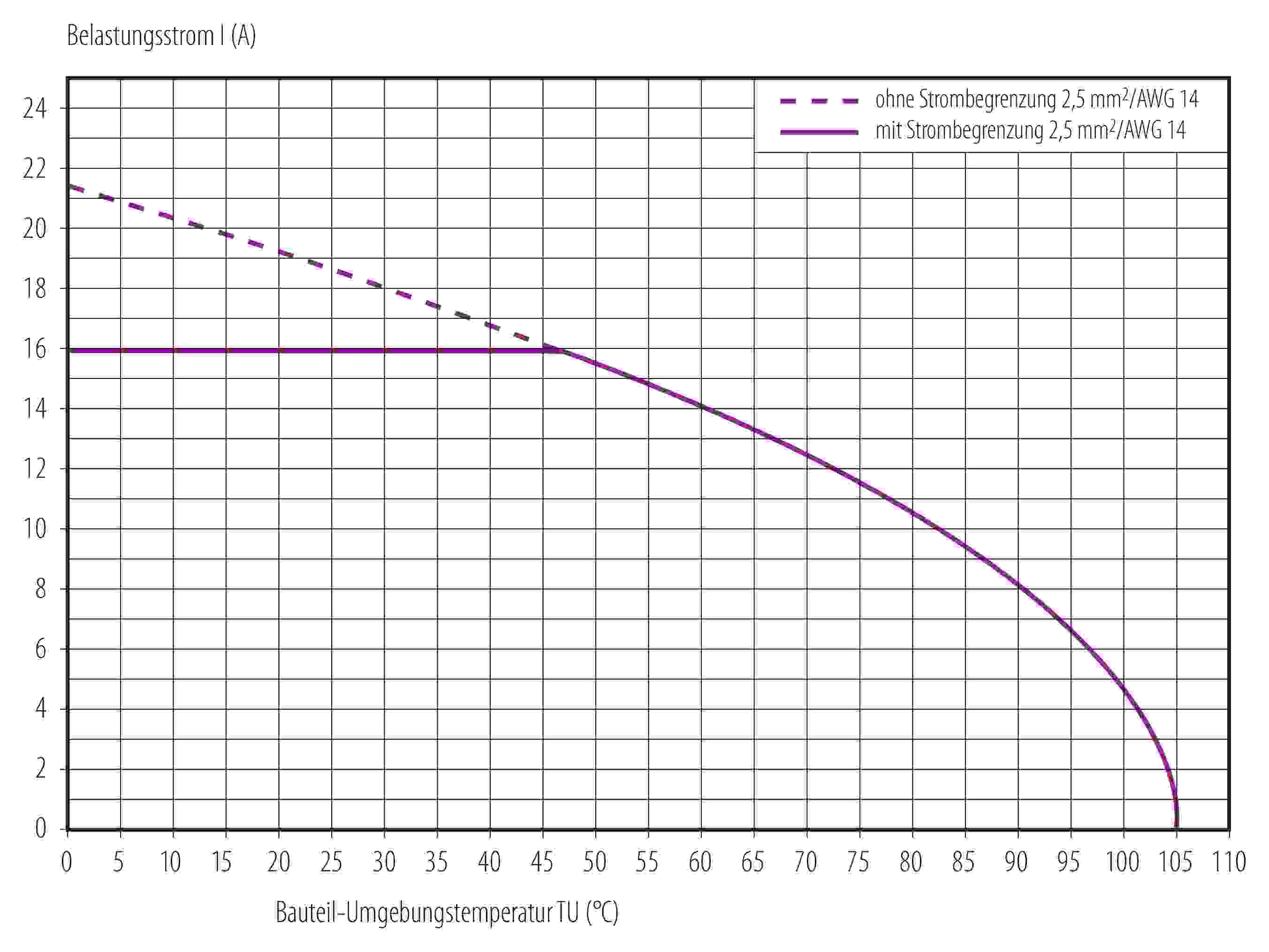 | Bemessungsstrom | 12 A (bei 1,5 mm²/AWG 16) / 16 A (bei 2,5mm²/AWG 14) |
