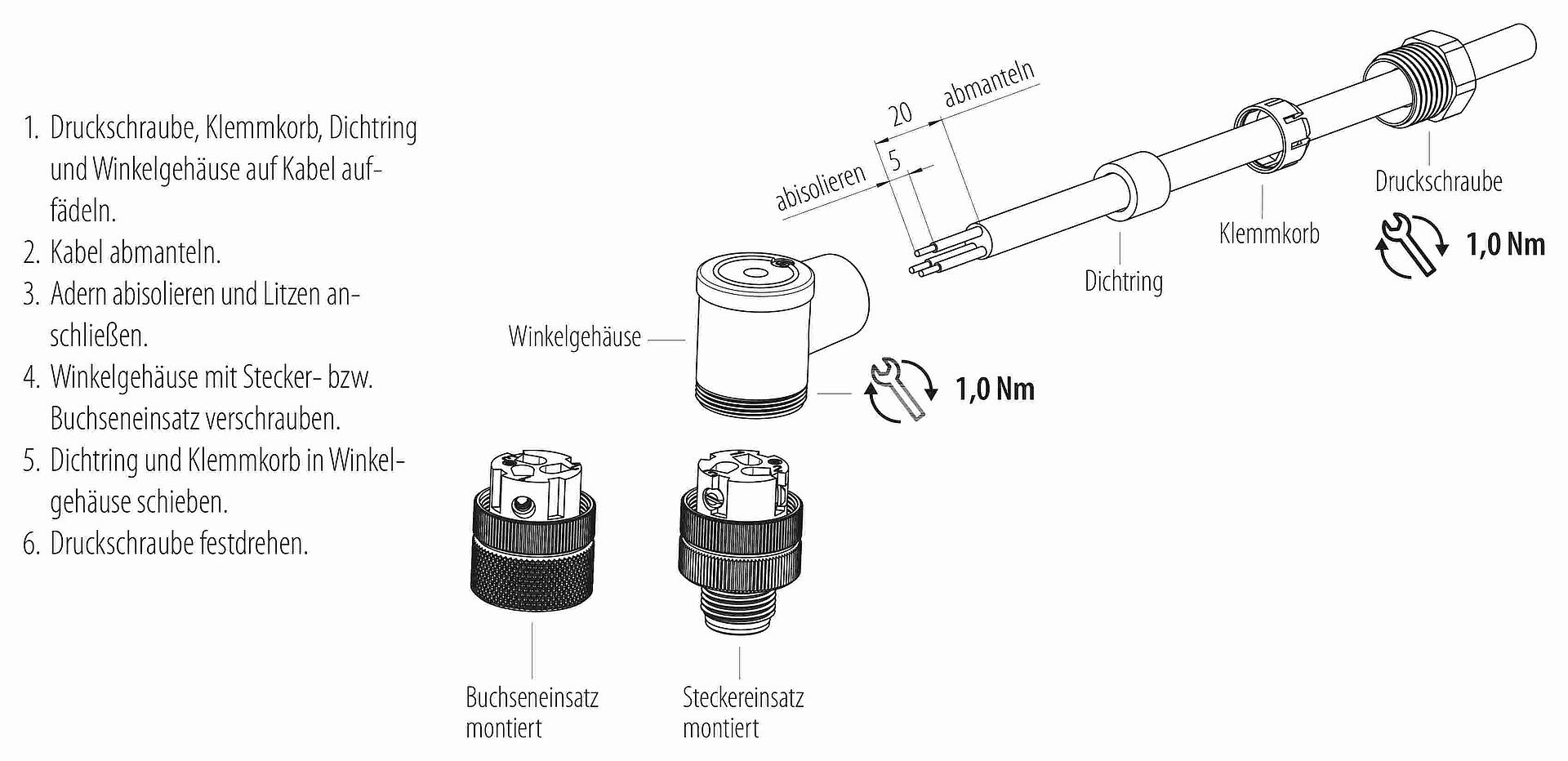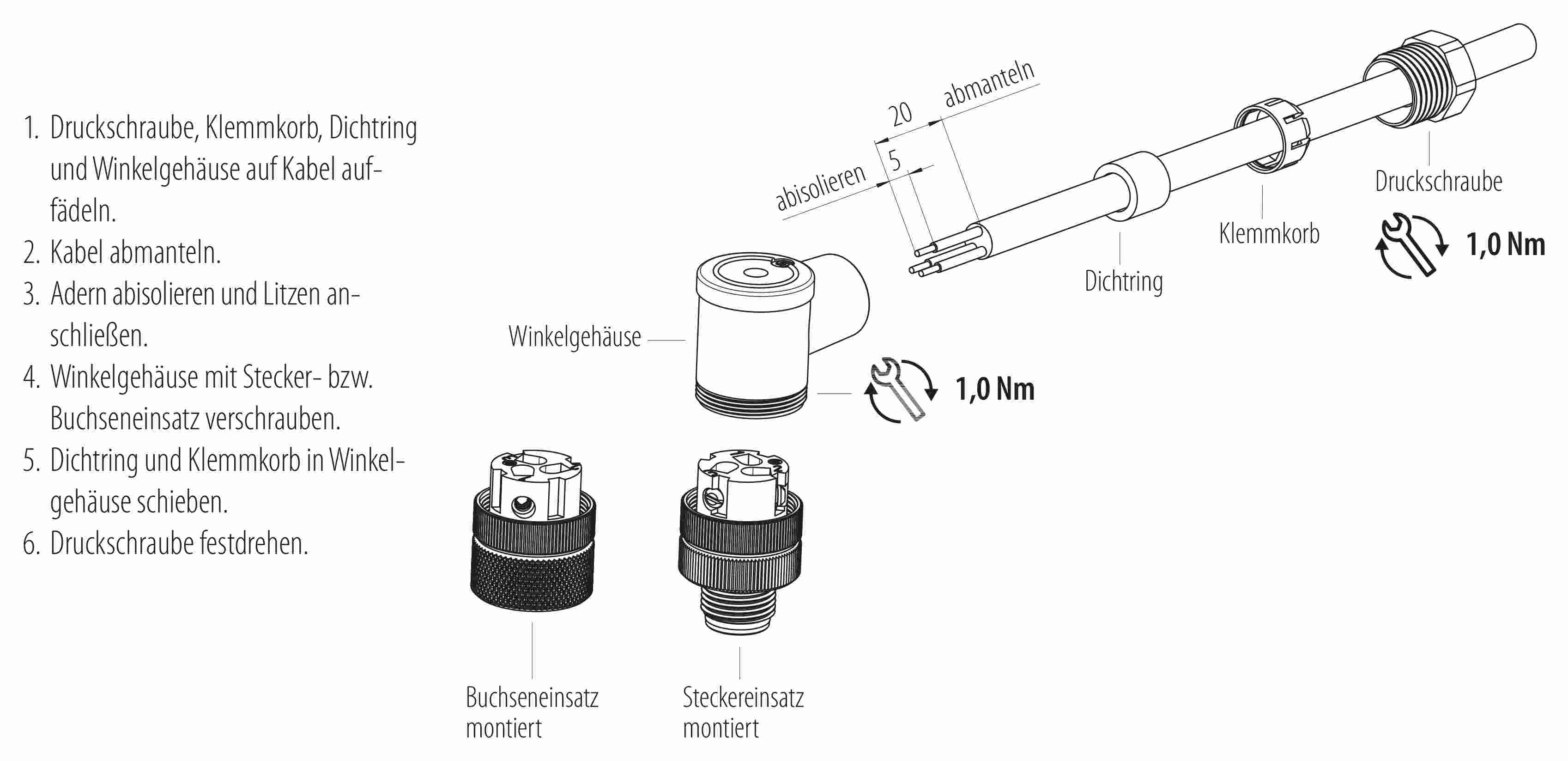 - Zum Verriegeln des Kabelsteckverbinders mit dem Gerätesteckverbinder wird der Gewindering „handfest“ (ca. 60 cNm) angezogen.