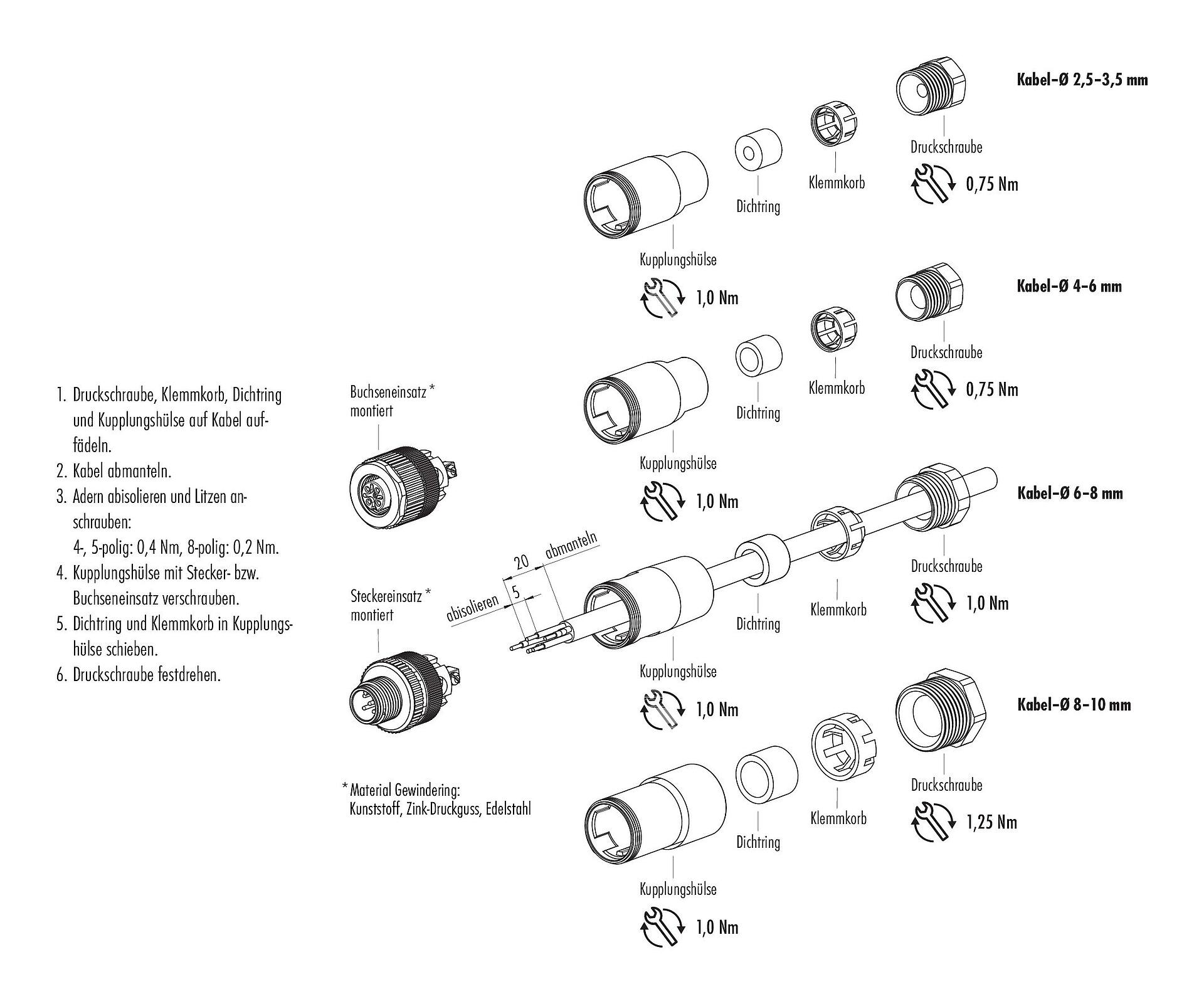 - Zum Schutz gegen unbeabsichtigtes Öffnen des Steckverbinders, ist bei einem Einsatz in Stromkreisen mit berührungsgefährlichen Spannungen das Gewinde zwischen dem Gehäuse und dem Steckverbinderkopf mit einem geeigneten Cyanacrylatkleber zu sichern. Dies gilt nicht für Steckverbinder, die in SELV und PELV Stromkreisen nach IEC 61140 (EN 61140, VDE 0140-1) eingesetzt werden.