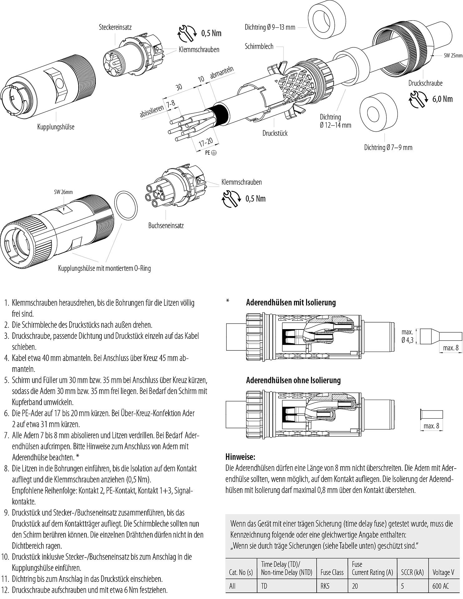 - Zum Schutz gegen unbeabsichtigtes Öffnen des Steckverbinders, ist bei einem Einsatz in Stromkreisen mit berührungsgefährlichen Spannungen das Gewinde zwischen dem Gehäuse und dem Steckverbinderkopf mit einem geeigneten Cyanacrylatkleber zu sichern. Dies gilt nicht für Steckverbinder, die in SELV und PELV Stromkreisen nach IEC 61140 (EN 61140, VDE 0140-1) eingesetzt werden.