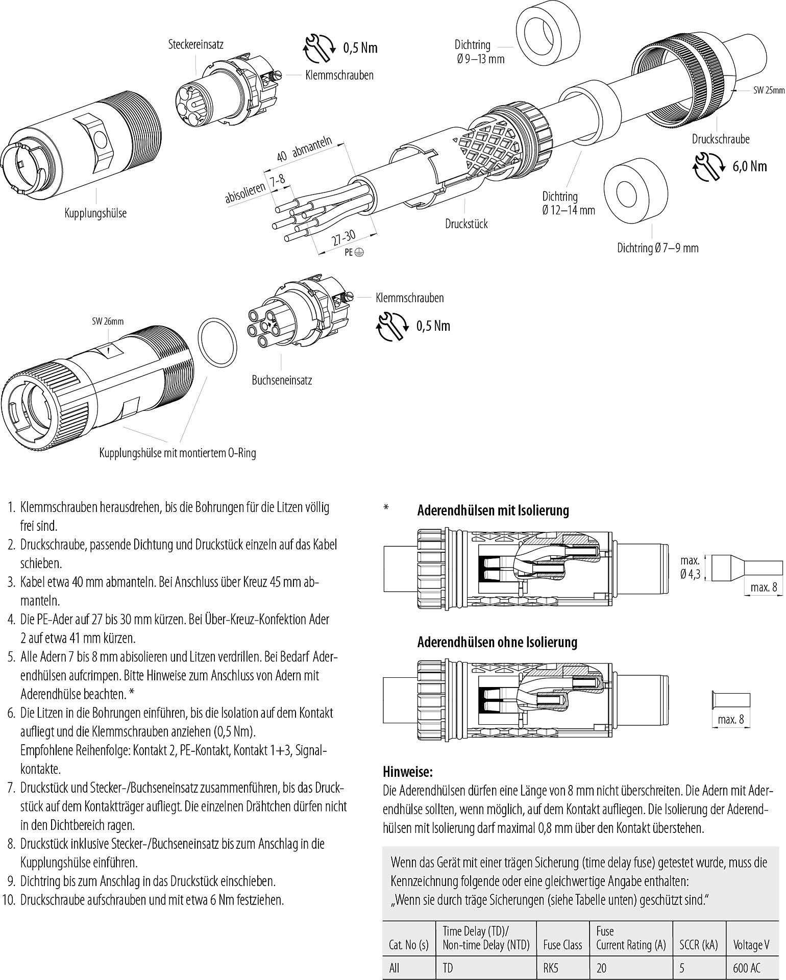 - Zum Schutz gegen unbeabsichtigtes Öffnen des Steckverbinders, ist bei einem Einsatz in Stromkreisen mit berührungsgefährlichen Spannungen das Gewinde zwischen dem Gehäuse und dem Steckverbinderkopf mit einem geeigneten Cyanacrylatkleber zu sichern. Dies gilt nicht für Steckverbinder, die in SELV und PELV Stromkreisen nach IEC 61140 (EN 61140, VDE 0140-1) eingesetzt werden.