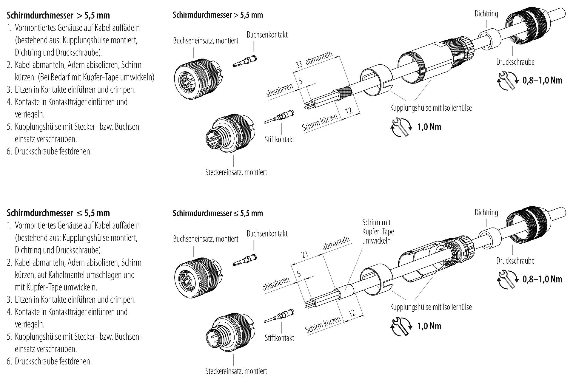 8. Zum Verriegeln des Kabelsteckverbinders mit dem Gerätesteckverbinder wird der Gewindering „handfest“ (ca. 60 cNm) angezogen.