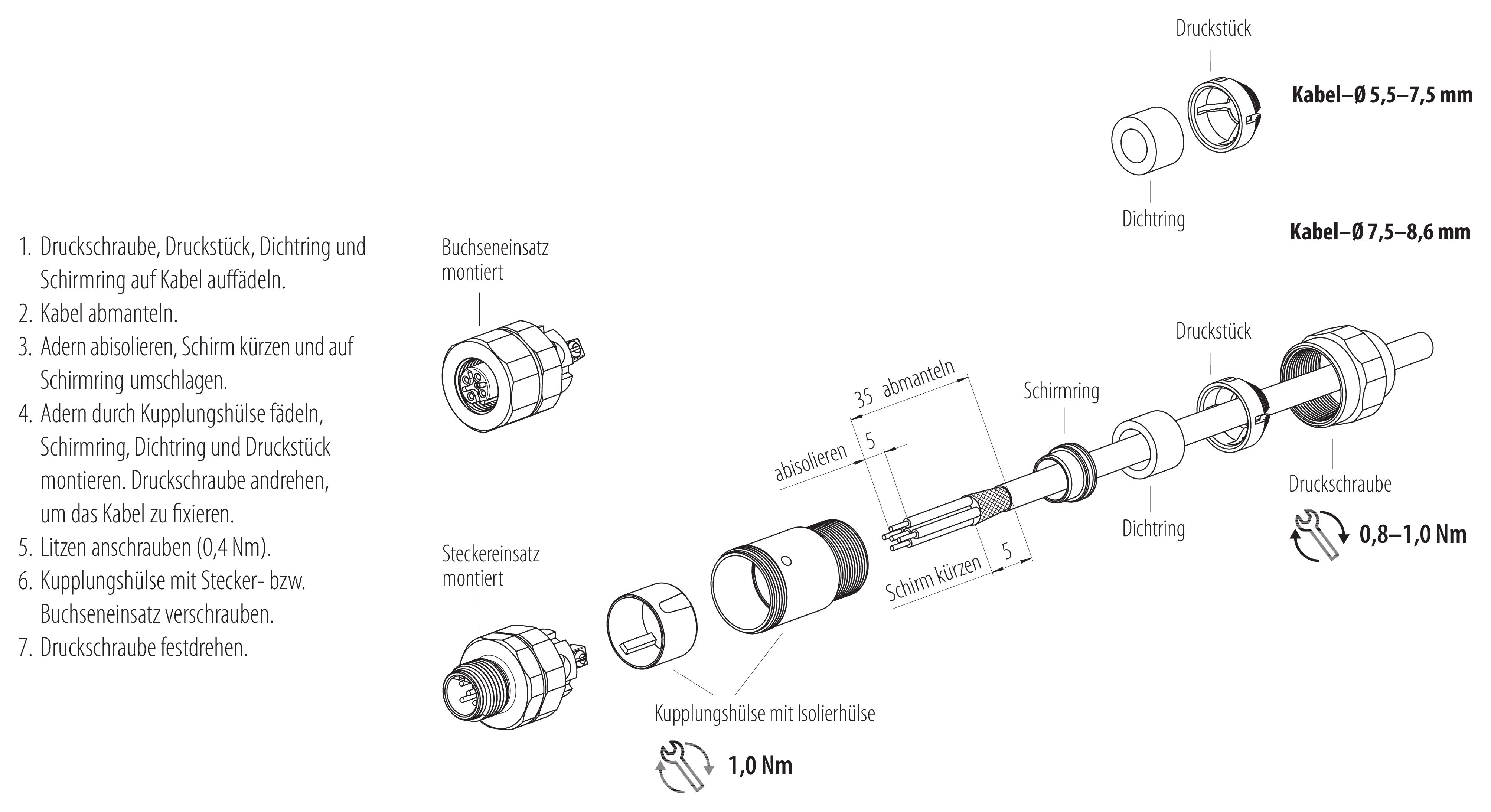 - Zum Verriegeln des Kabelsteckverbinders mit dem Gerätesteckverbinder wird der Gewindering „handfest“ (ca. 60 cNm) angezogen.