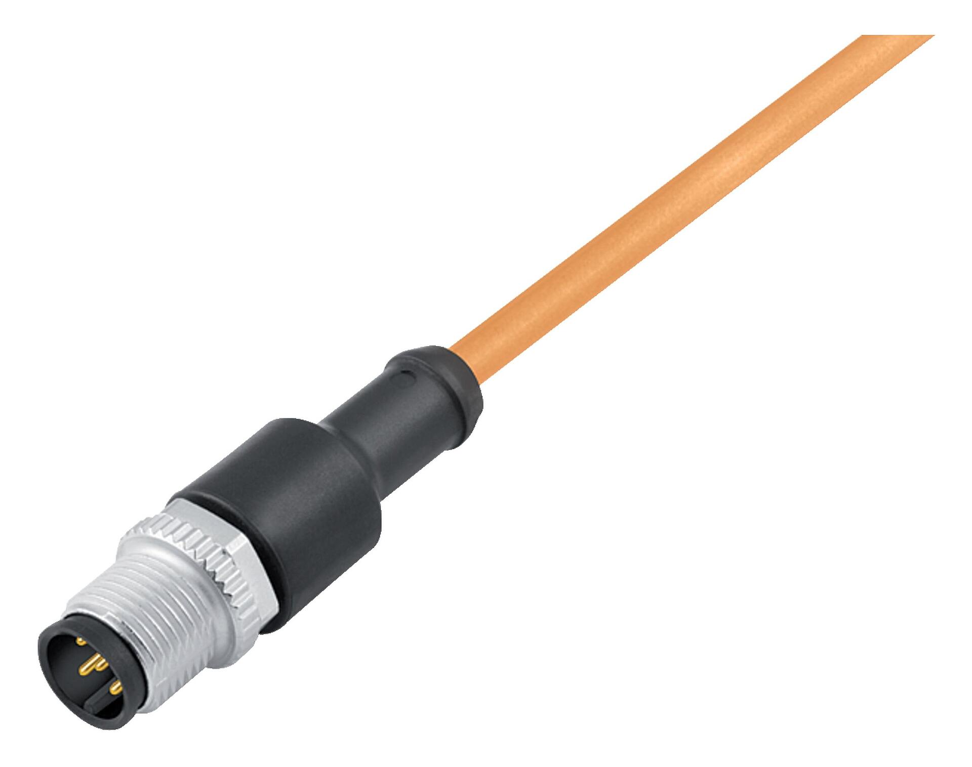 M12 Male cable connector, Contacts: 3, unshielded, moulded on the cable, IP69K, UL 2238, PUR, orange, 3 x 0.34 mm², for welding applications, 5 m