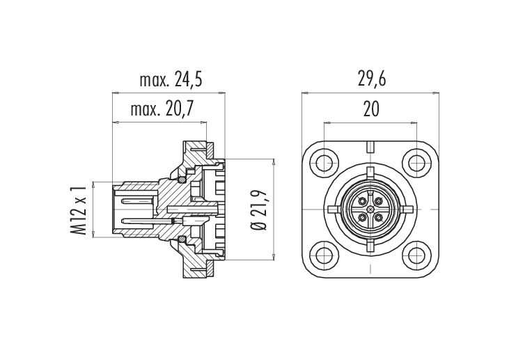 M12 Embase mâle, carré, Contacts: 4, non blindé, souder, IP40, M3 (4x), Montage frontal, Alignement de codage positionnable