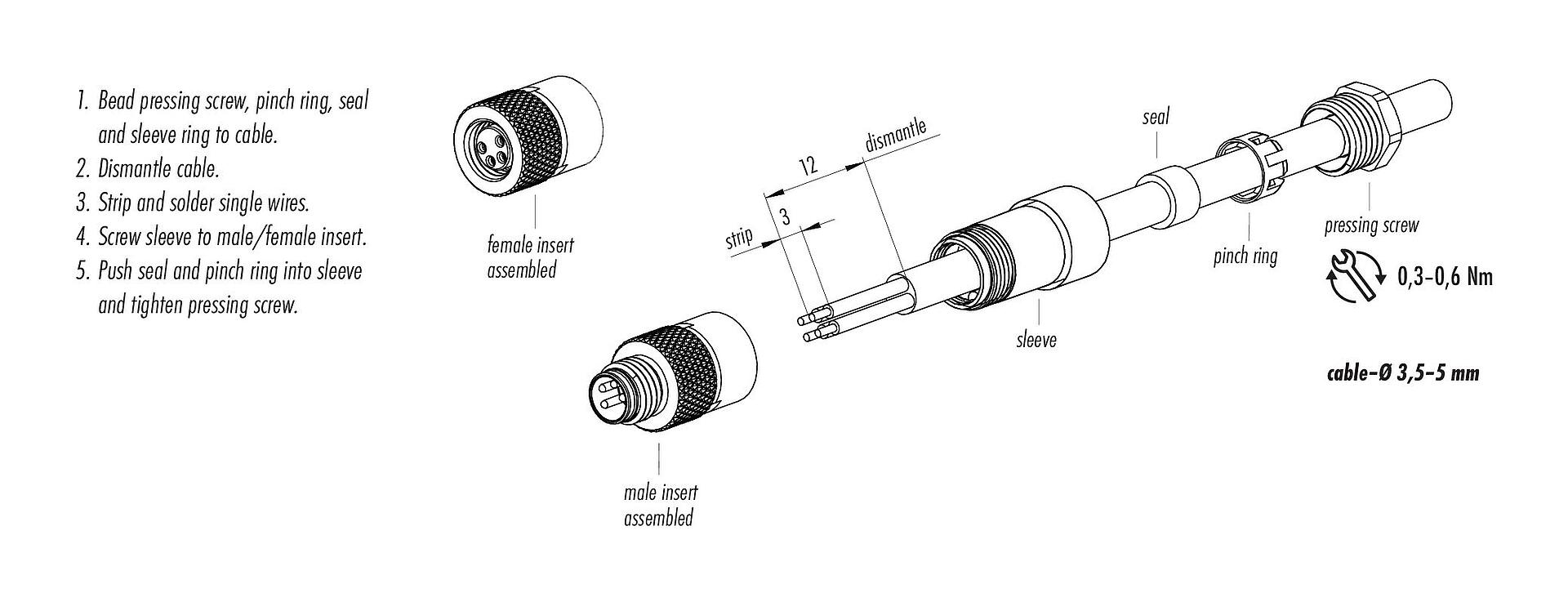 - Pour éviter l'ouverture involontaire du connecteur, lorsqu'il est utilisé dans des circuits dont la tension est dangereuse au toucher, le fil entre le boîtier et la tête du connecteur doit être fixé avec un adhésif cyanoacrylate approprié. Ceci ne s'applique pas aux connecteurs utilisés dans les circuits SELV et PELV selon la norme IEC 61140 (EN 61140, VDE 0140-1).