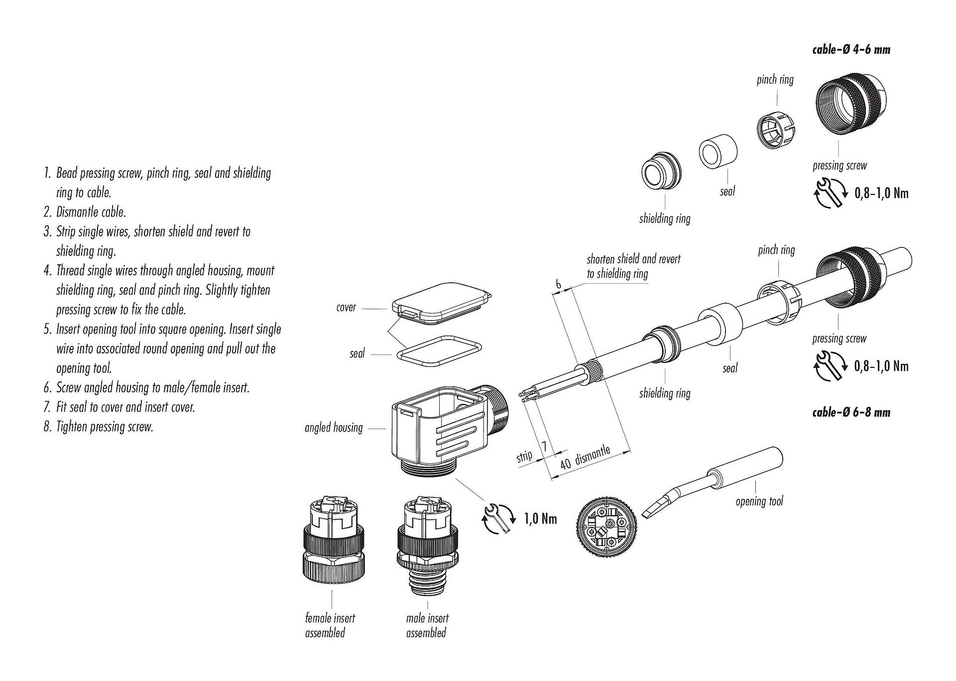 - Per proteggere dall'apertura involontaria del connettore, la filettatura tra l'alloggiamento e la testa del connettore deve essere fissata con un adesivo cianoacrilato adatto quando viene utilizzato in circuiti con tensioni pericolose al tatto. Questo non vale per i connettori utilizzati in circuiti SELV e PELV secondo IEC 61140 (EN 61140, VDE 0140-1).