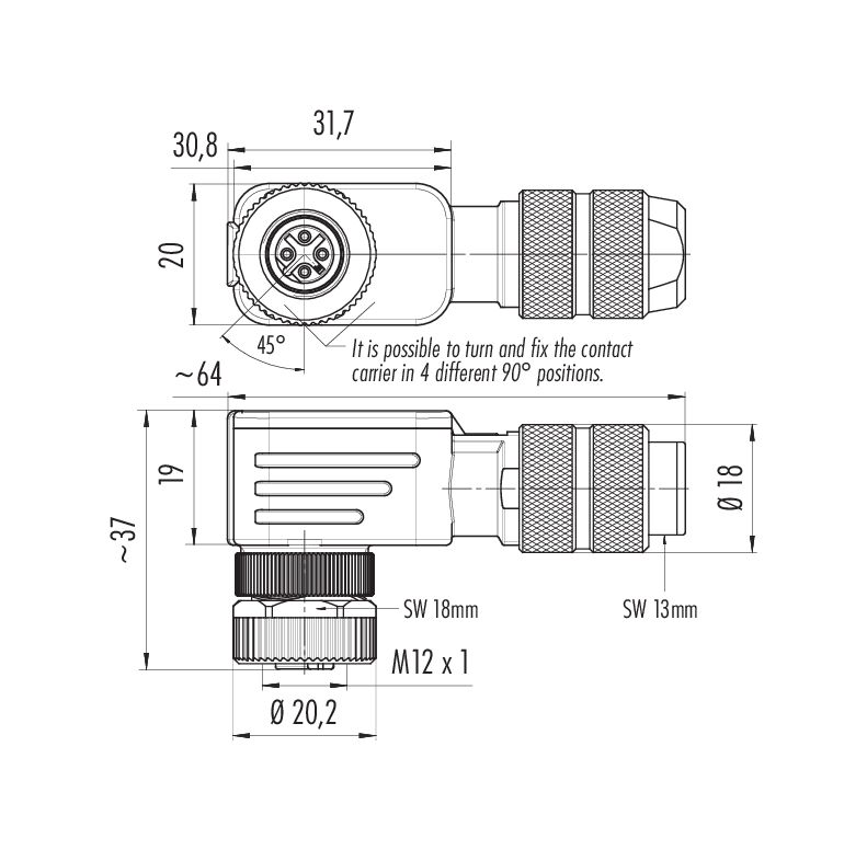 M12 Úhlový box, : 4, 5,0-8,0 mm, stínitelné, krimpování (krimpovací kontakty je třeba objednat zvlášť), IP67, UL 2238