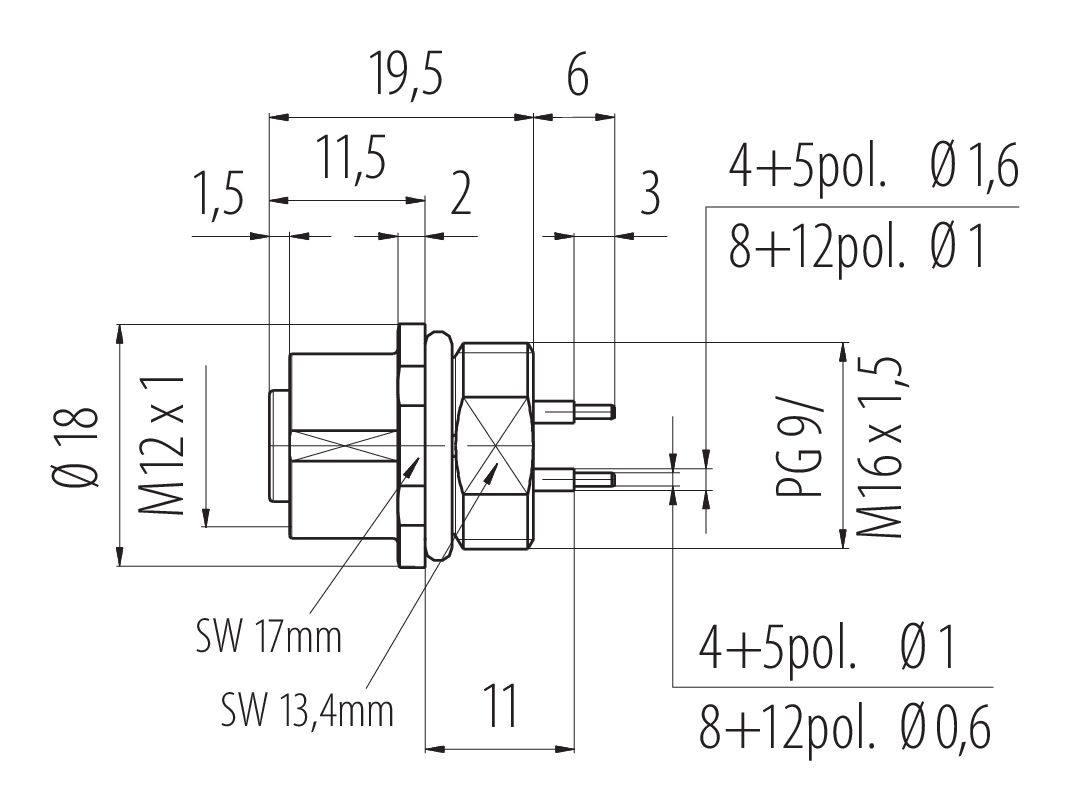 M12 Přírubová zásuvka, : 12, nestíněný, THT, IP68, UL 2238, PG 9, Přední montáž