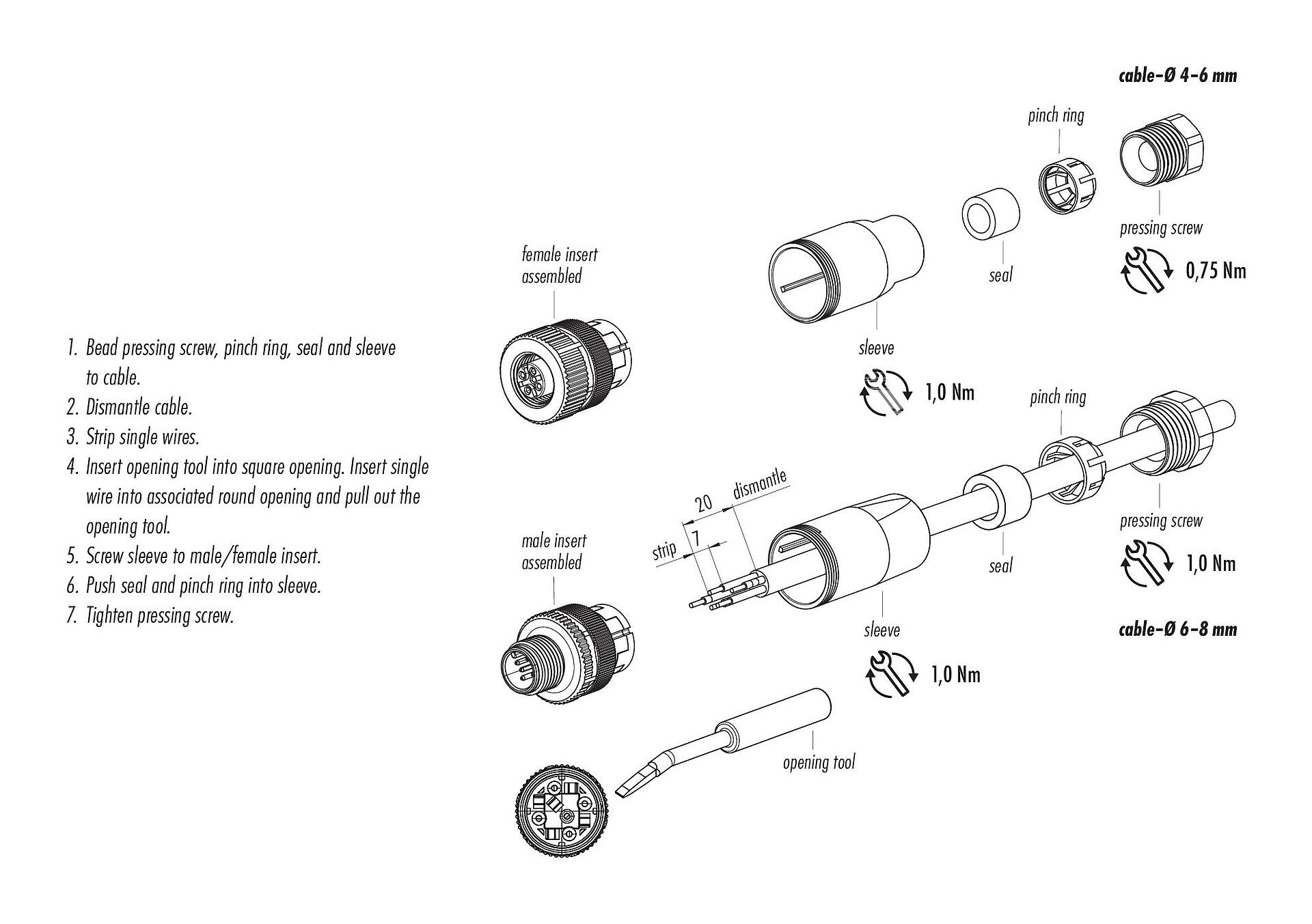 - Liittimen tahattoman avaamisen estämiseksi kotelon ja liitinpään välinen lanka on kiinnitettävä sopivalla syanoakrylaattiliimalla, kun sitä käytetään piireissä, joiden jännite on vaarallinen koskettaa. Tämä ei koske liittimiä, joita käytetään SELV- ja PELV-piireissä standardin IEC 61140 (EN 61140, VDE 0140-1) mukaisesti.