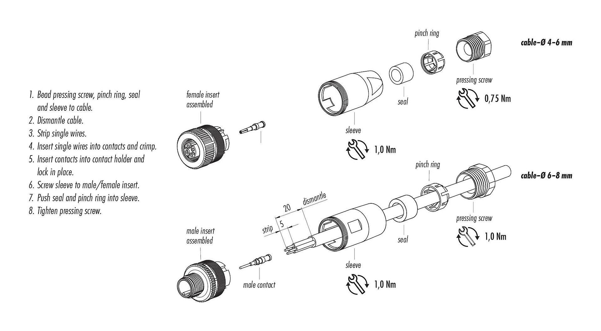 8. Kaapeliliittimen lukitsemiseksi laiteliittimellä kierteitetty rengas kiristetään "käsin tiukasti" (noin 60 cNm).