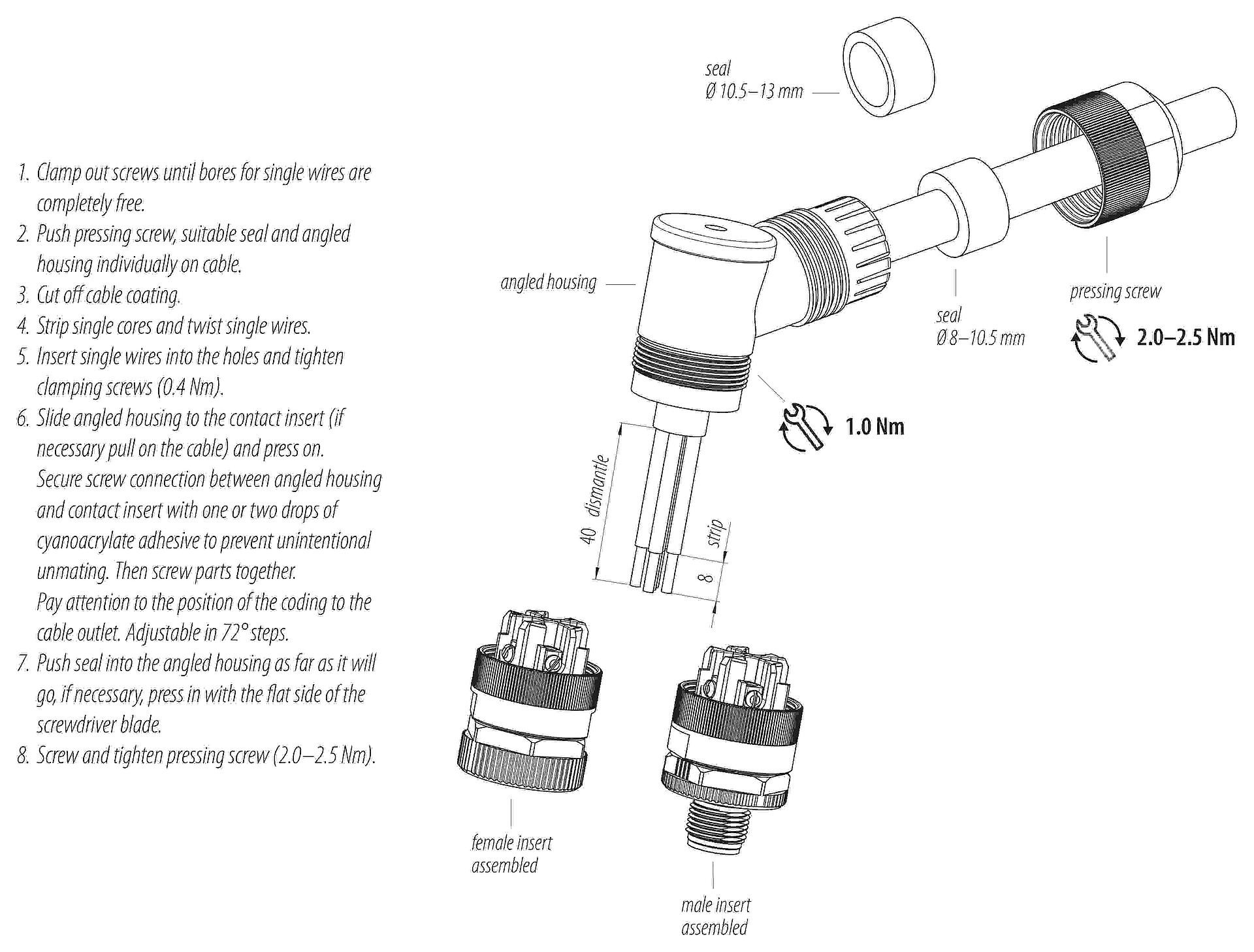 3. Pour éviter l'ouverture involontaire du connecteur, lorsqu'il est utilisé dans des circuits dont la tension est dangereuse au toucher, le fil entre le boîtier et la tête du connecteur doit être fixé avec un adhésif cyanoacrylate approprié. Ceci ne s'applique pas aux connecteurs utilisés dans les circuits SELV et PELV selon la norme IEC 61140 (EN 61140, VDE 0140-1).