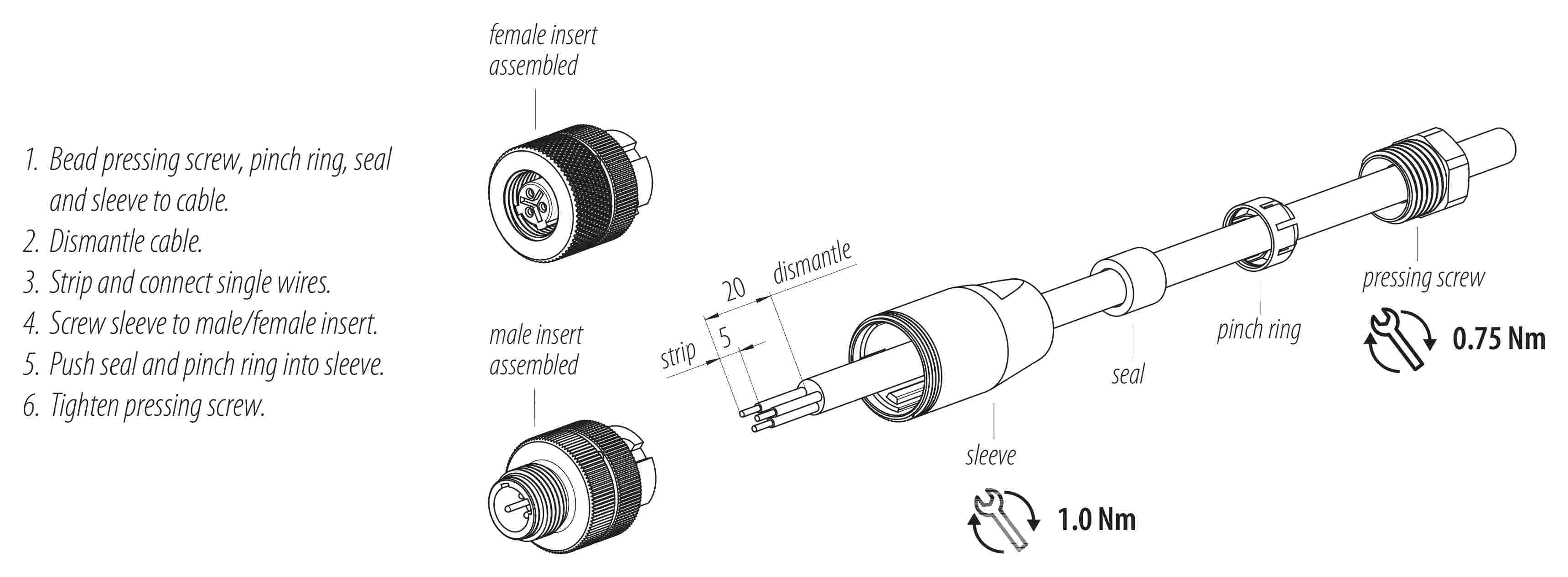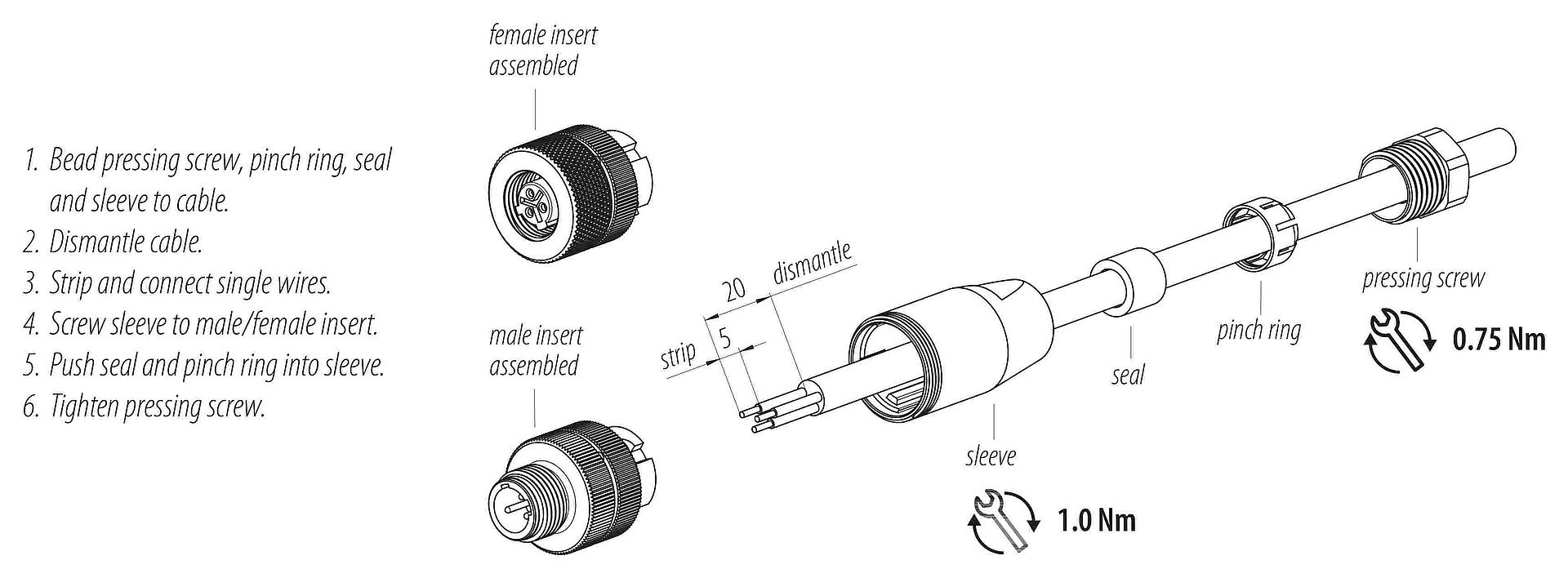 - Pour éviter l'ouverture involontaire du connecteur, lorsqu'il est utilisé dans des circuits dont la tension est dangereuse au toucher, le fil entre le boîtier et la tête du connecteur doit être fixé avec un adhésif cyanoacrylate approprié. Ceci ne s'applique pas aux connecteurs utilisés dans les circuits SELV et PELV selon la norme IEC 61140 (EN 61140, VDE 0140-1).