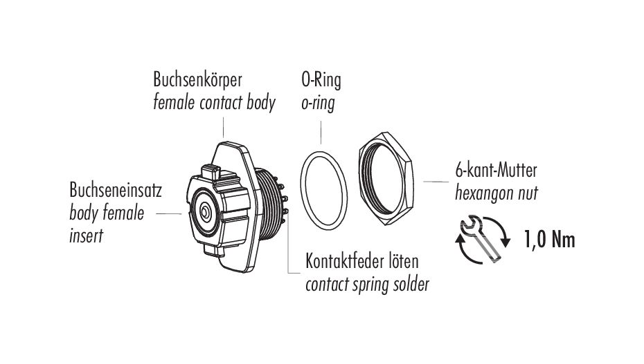 - Pour verrouiller le connecteur de câble avec le connecteur d'appareil, il est recommandé de serrer la bague filetée à 1 Nm. Une clé dynamométrique adaptée est disponible en tant qu'accessoire (référence 07 0082 000).