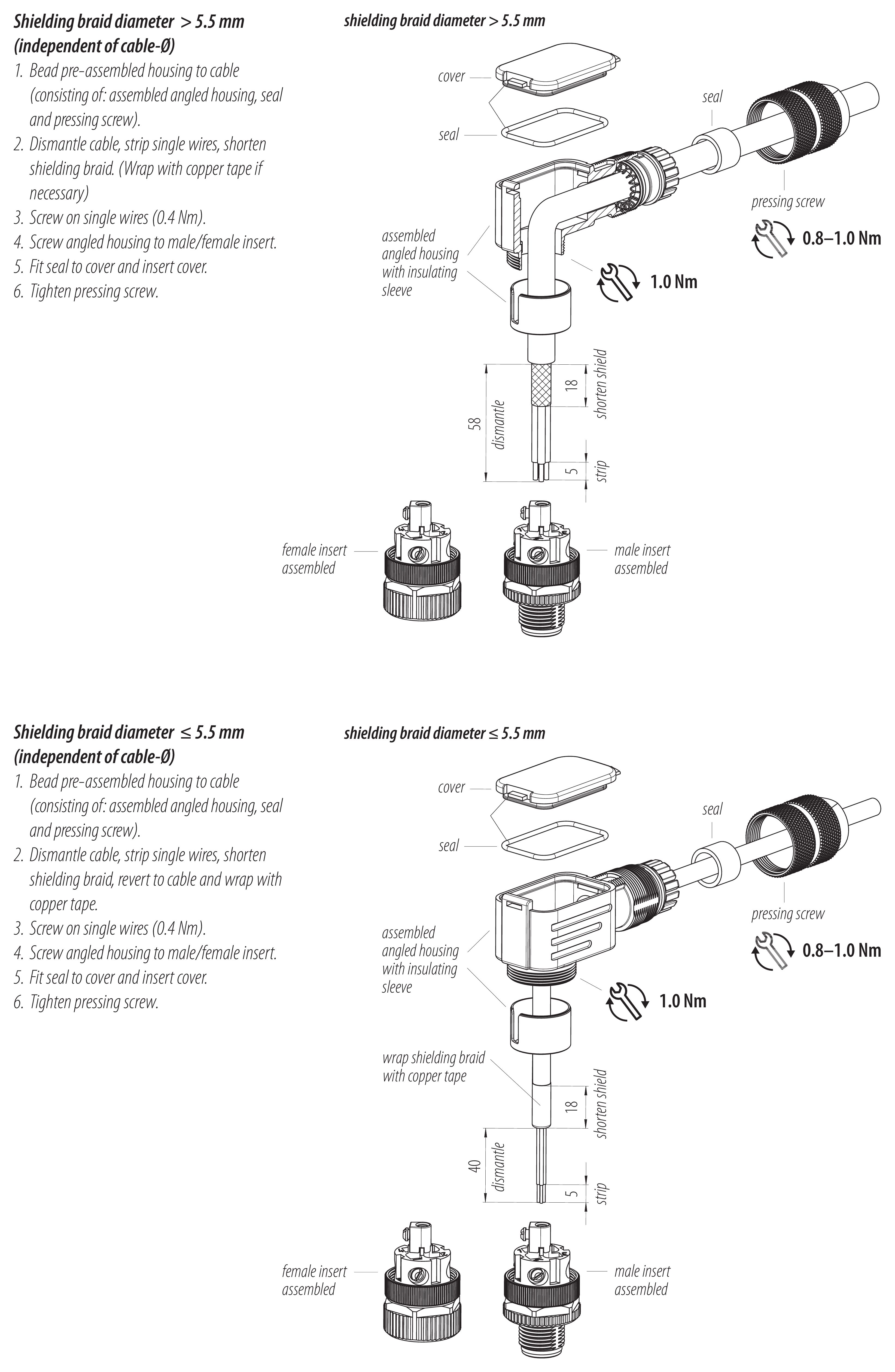 - Pour éviter l'ouverture involontaire du connecteur, lorsqu'il est utilisé dans des circuits dont la tension est dangereuse au toucher, le fil entre le boîtier et la tête du connecteur doit être fixé avec un adhésif cyanoacrylate approprié. Ceci ne s'applique pas aux connecteurs utilisés dans les circuits SELV et PELV selon la norme IEC 61140 (EN 61140, VDE 0140-1).