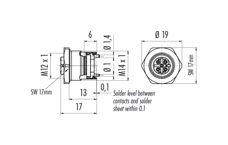 M12 Embase femelle, Contacts: 5, blindable, SMT, IP67, M14x1,0, Montage frontal