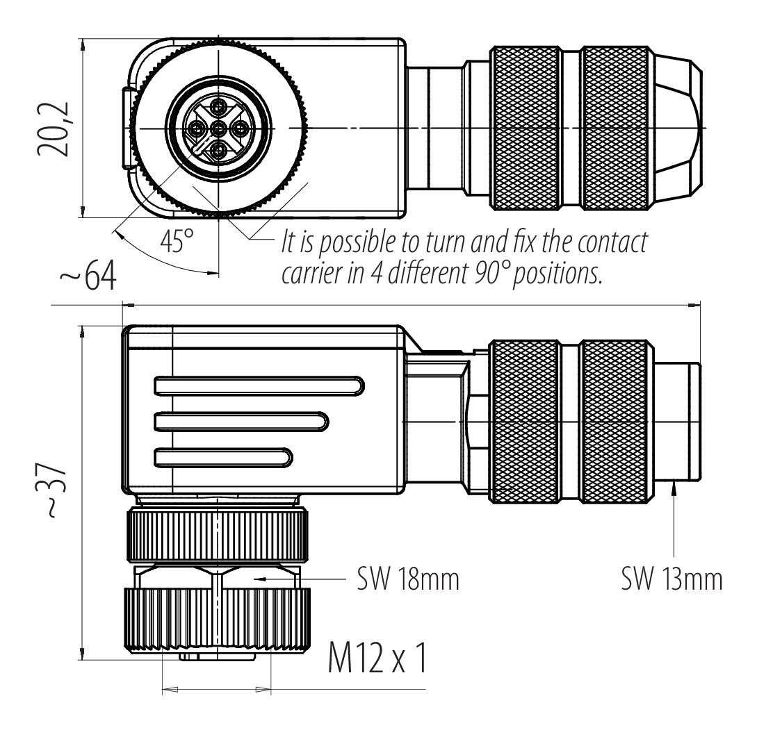 M12 Connecteur femelle coudé, Contacts: 4, 5,0-8,0 mm, blindable, pince à visser, IP67, UL 2238