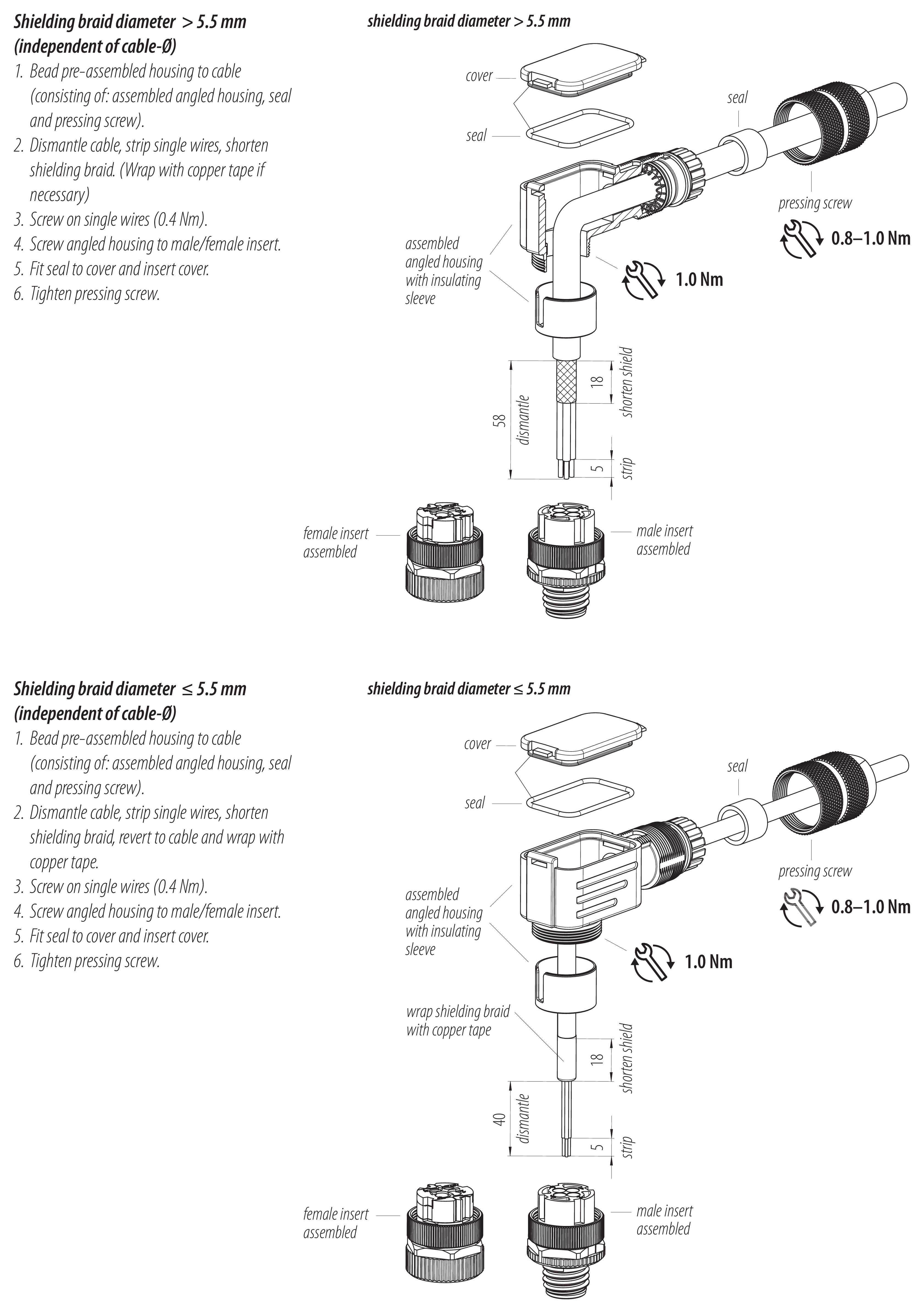 - Pour éviter l'ouverture involontaire du connecteur, lorsqu'il est utilisé dans des circuits dont la tension est dangereuse au toucher, le fil entre le boîtier et la tête du connecteur doit être fixé avec un adhésif cyanoacrylate approprié. Ceci ne s'applique pas aux connecteurs utilisés dans les circuits SELV et PELV selon la norme IEC 61140 (EN 61140, VDE 0140-1).