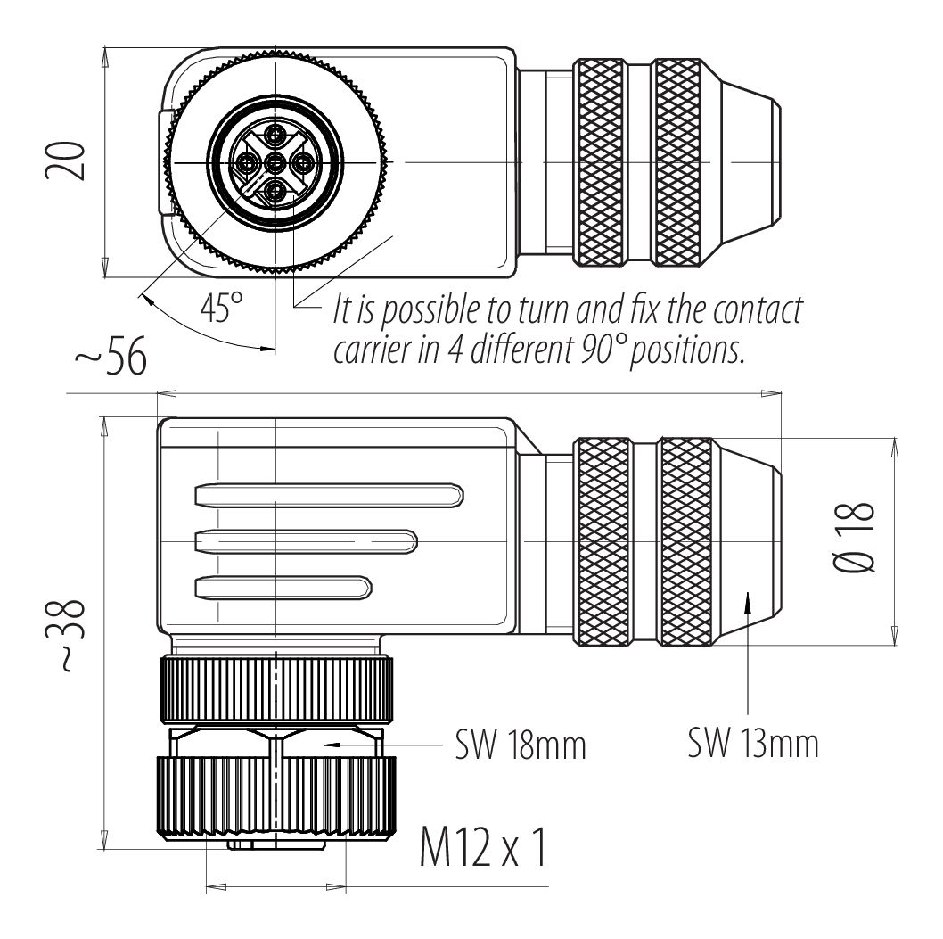 M12 Connecteur femelle coudé, Contacts: 4, 6,0-8,0 mm, blindable, pince à visser, IP67, UL 2238, avec anneau de protection
