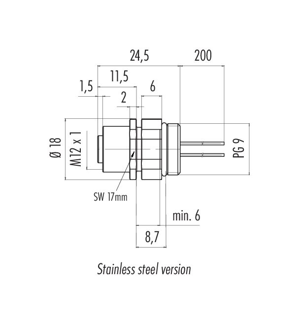 M12 Embase femelle, Contacts: 4, non blindé, fils, IP68/IP69K, UL 2238, PG 9, Montage frontal, Acier inoxydable, positionnable