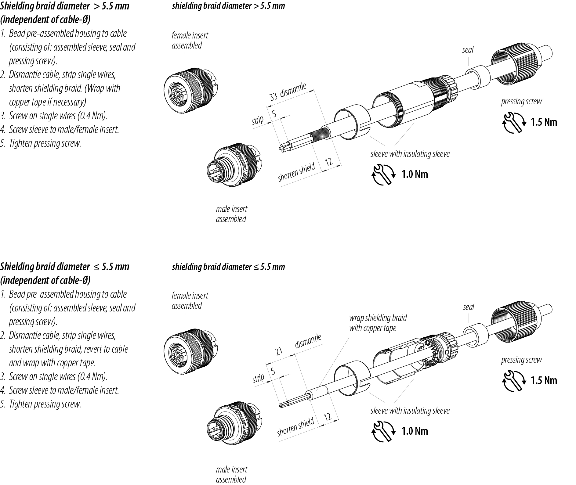 - För att låsa kabelkontakten med enhetskontakten dras den gängade ringen "handtätt" (ca 60 cNm).
