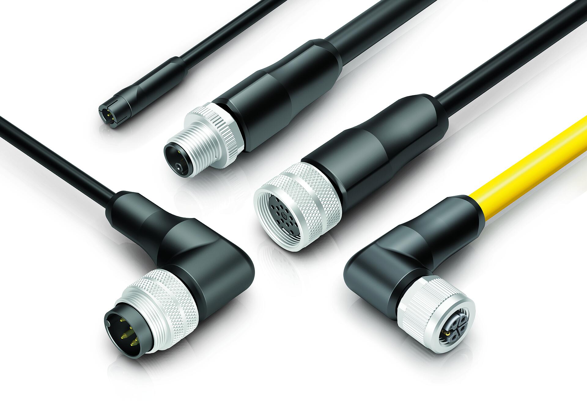 Die Kabelsteckverbinder sind sowohl geschirmt als auch ungeschirmt erhältlich und werden direkt am PUR-Kabel umspritzt. Standardmäßig stehen Kabellängen von 2 m und 5 mzur Verfügung, weitere Längen sind auf Anfrage realisierbar.