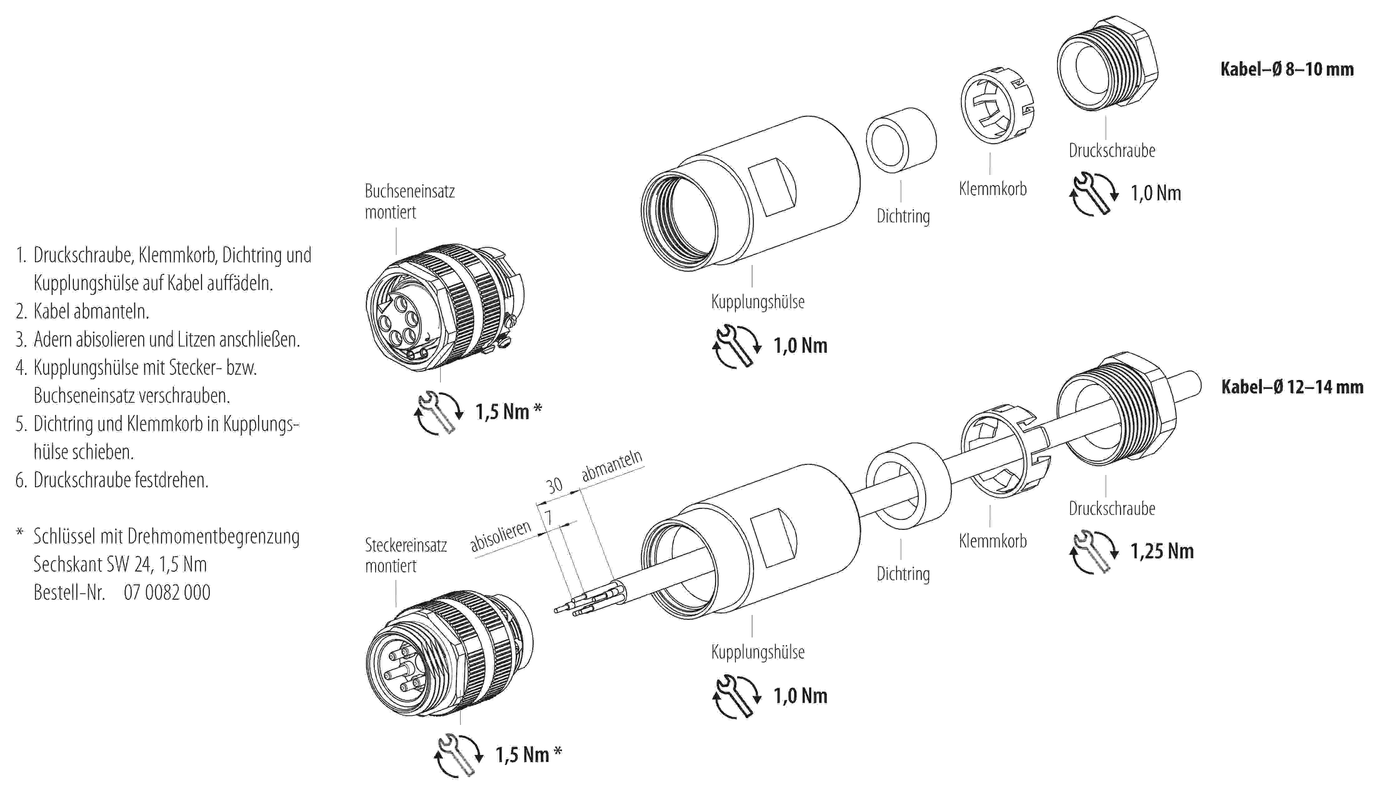 - Zum Verriegeln des Kabelsteckverbinders mit dem Gerätesteckverbinder wird empfohlen den Gewindering mit 1,5 Nm anzuziehen. Ein passender Drehmomentschlüssel ist als Zubehör erhältlich (Bestell.-Nr. 07 0082 000).