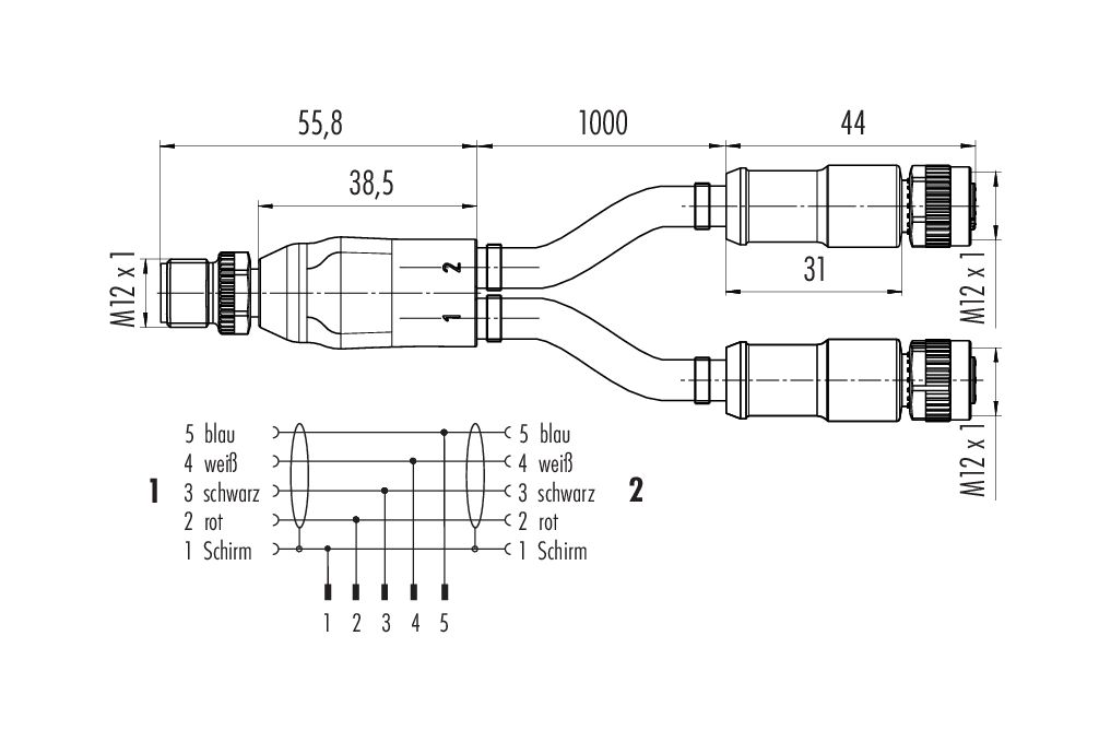 4. M12 Kabelsplitter Kabelstecker - 2 Kabeldosen, Polzahl: 5, geschirmt, am Kabel angespritzt, IP67, CAN-Bus, PUR, violett, 1 x 2 x AWG 22 + 1 x 2 x AWG 24, 1 m